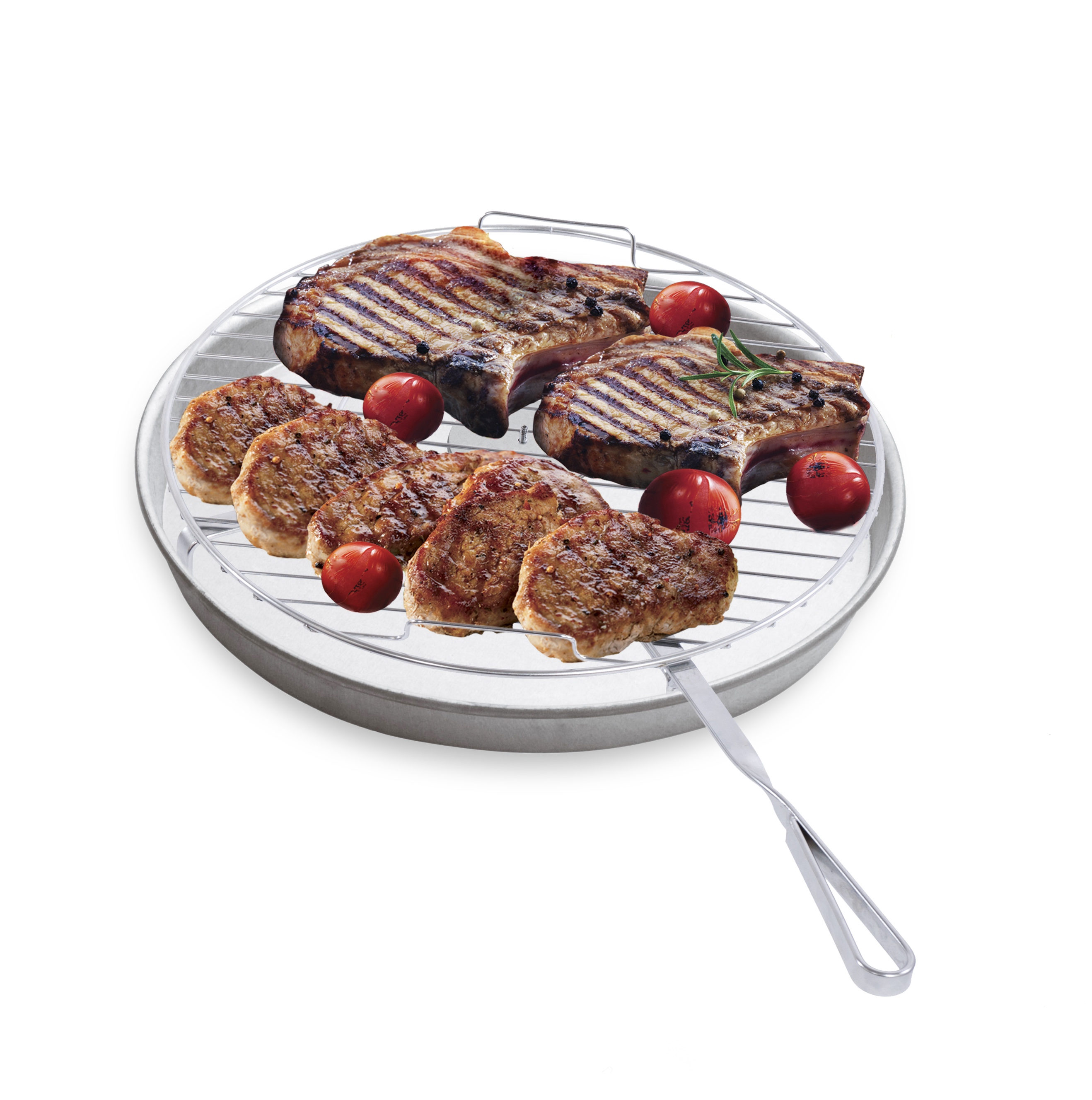 Das BBQ 500 besteht aus drei einfachen und zweckmäßigen Teilen. Dem Grillblech, das als Glutschale und als Unterlage für den Grillrost im Backofen dient. Dem drehbaren Grillrost, der dank der angepassten Konstruktion sicher auf der Unterlage platziert werden kann und auf dem das Grillgut aufgelegt wird. Der praktischen Grillzange zum Drehen des Grillrosts und zum Wenden des Grillguts, für perfektes Garen ohne Verbrennungsgefahr.