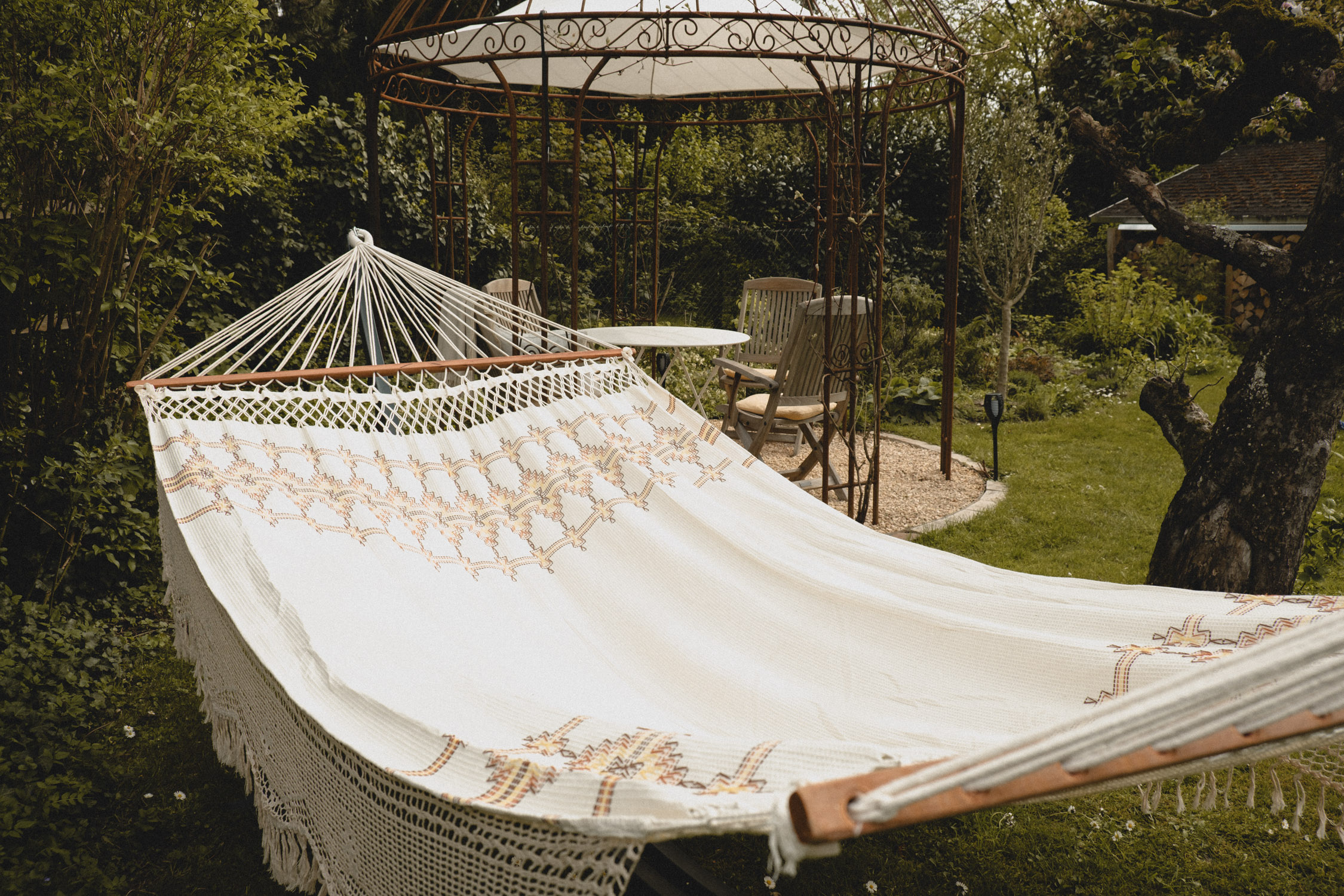 Die XXL Stabhängematte Palacio Boho, groß wie ein französisches Bett, lädt zum Träumen und Entspannen ein. Die wunderschöne, handgeknüpfte Zierborte macht die Hängematte zu etwas ganz Besonderem.