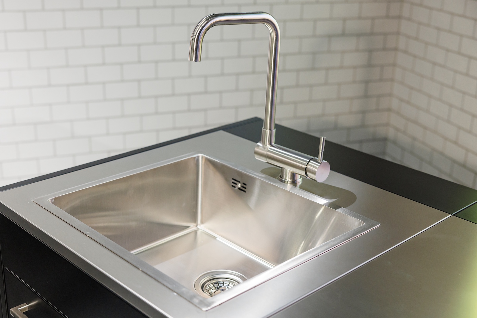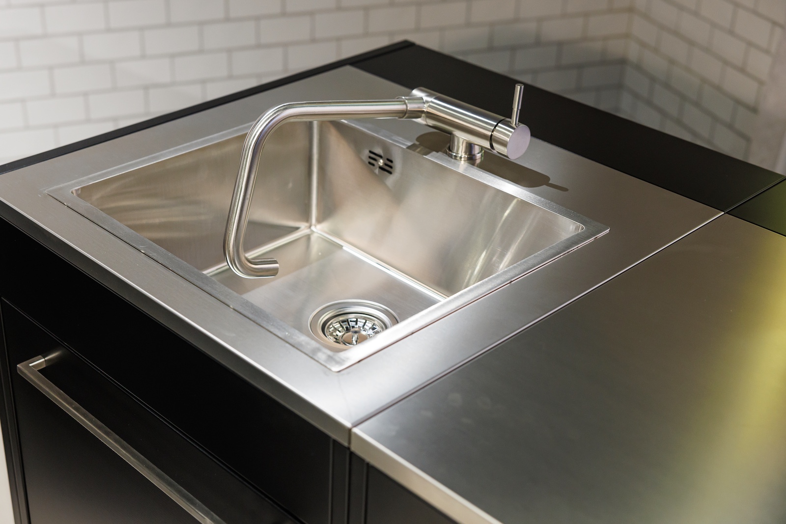- Arbeitsfläche, Griffe & Spüle aus gebürstetem Edelstahl