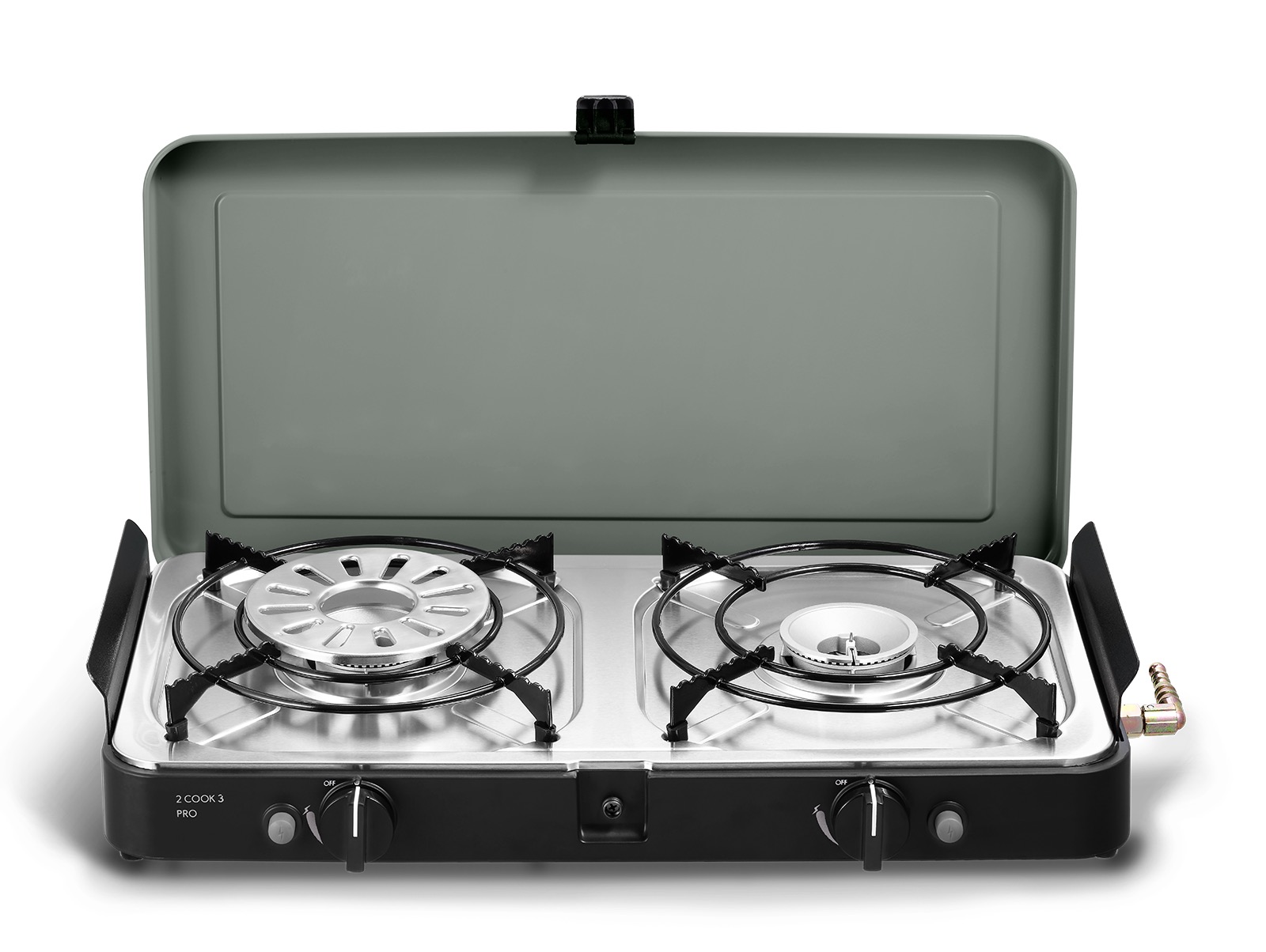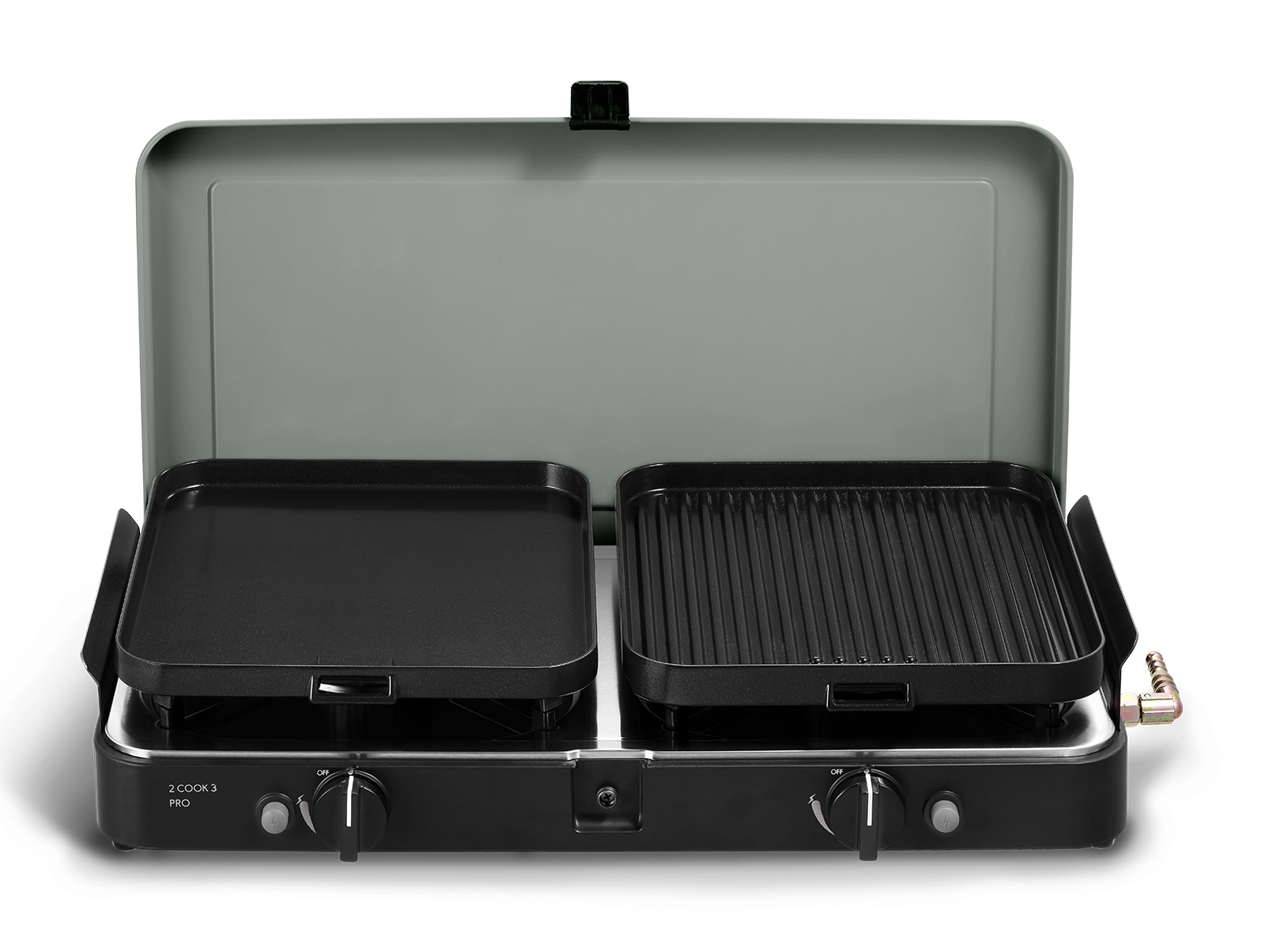 Der 2-Cook 3 Pro Deluxe wird mit zwei Topfständern mit Gummifüßen, einer keramikbeschichteten flachen Platte und einer gerippten Platte, einem Kaffekannenständer sowie einer praktischen Trage-/Aufbewahrungstasche geliefert. Da dieses Produkt über zwei unabhängige Kochstellen verfügt, kann ein Topf auf der anderen Seite verwendet werden, während das Fleisch gegrillt wird. Die flache Platte ist ideal zum Garen von Fisch, Frühstück und Pfannkuchen und die gerippte Platte eignet für das Grillen von Fleisch, Fisch, Hähnchen und Gemüse. Beide Platten sind mit einer GreenGrill-Keramikbeschichtung versehen und können mit einem separaten Griff (inklusive) abgenommen werden. Abnehmbare Windschutzbleche an den Seiten verhindern, dass die Gasflamme während des Kochens ausgeht. Darüber hinaus sorgen die Gummifüße an der Unterseite für zusätzliche Stabilität und Sicherheit, da sie das Verrutschen des Kochers verhindern.