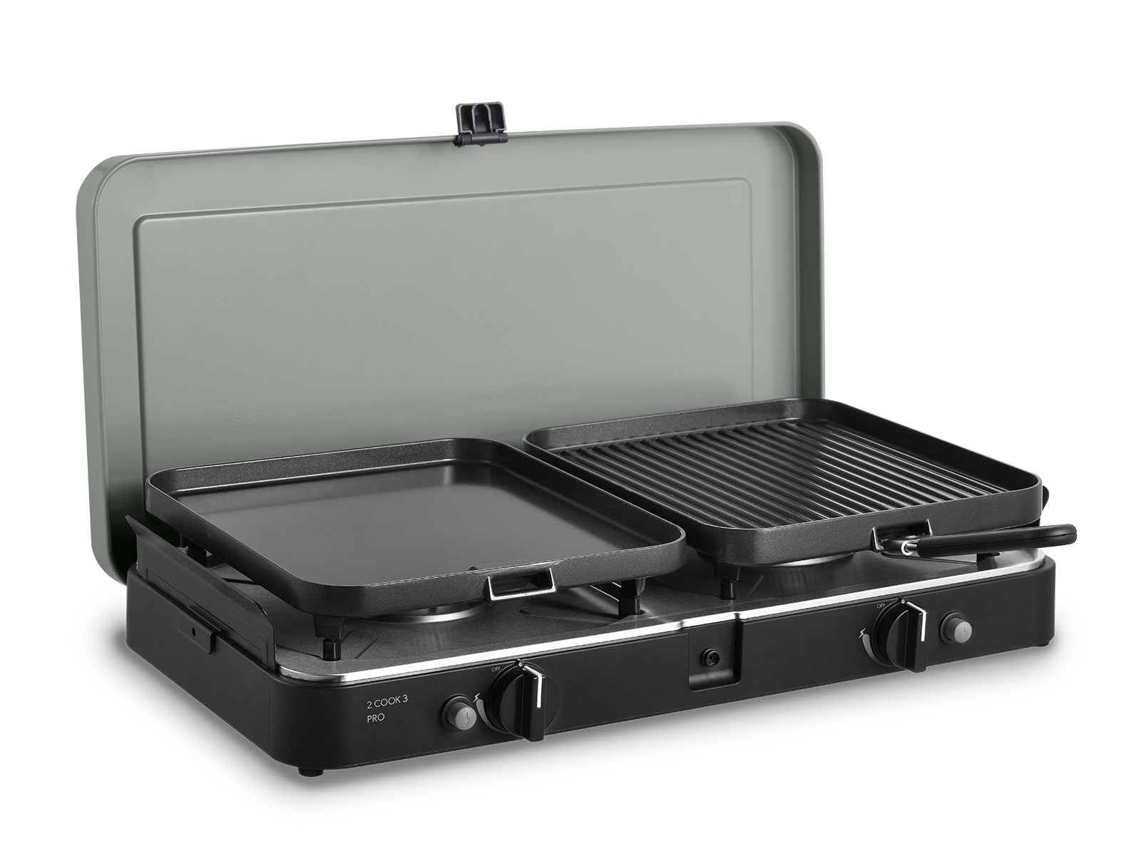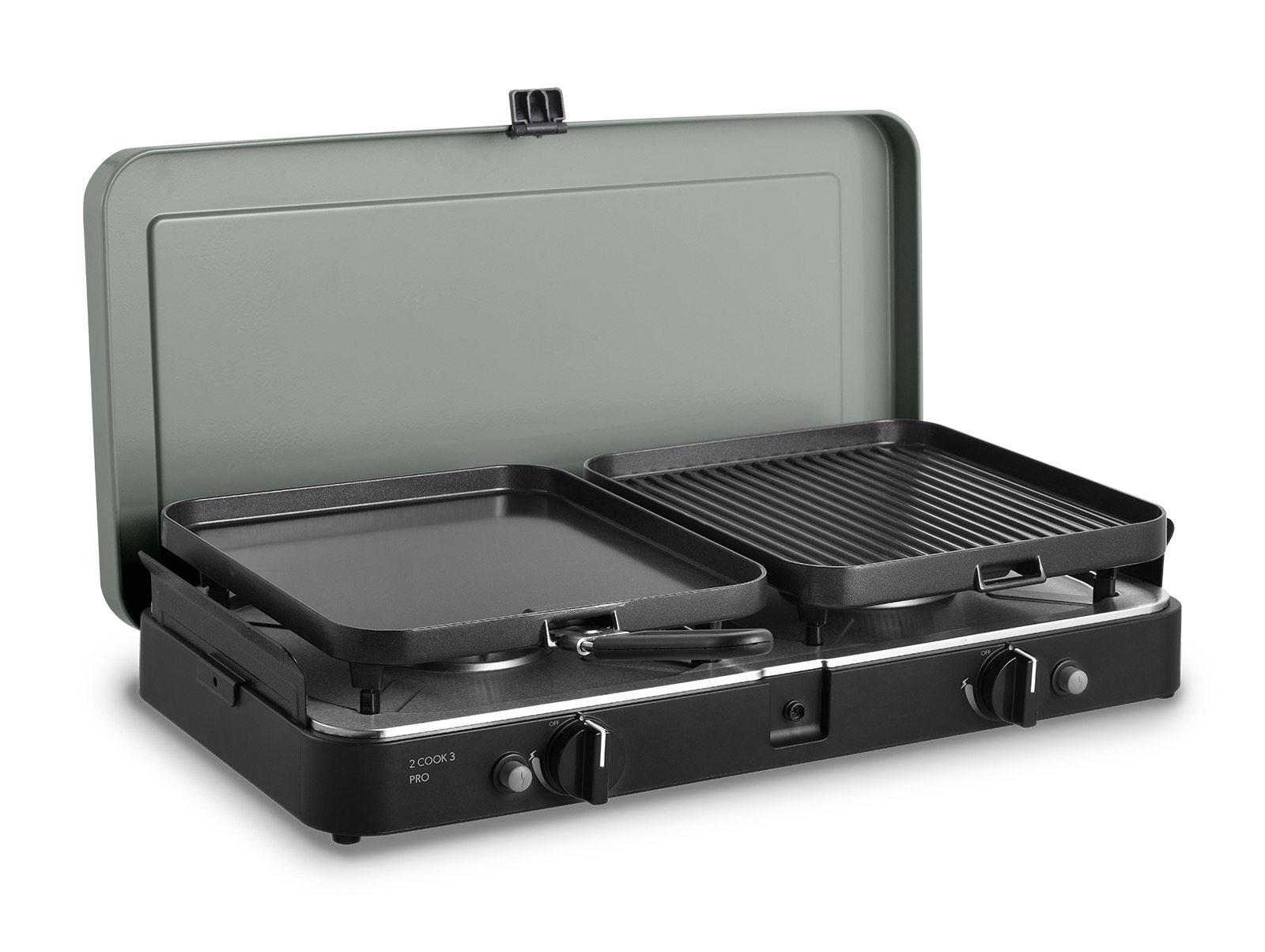 Der 2-Cook 3 Pro Deluxe wird mit zwei Topfständern mit Gummifüßen, einer keramikbeschichteten flachen Platte und einer gerippten Platte, einem Kaffekannenständer sowie einer praktischen Trage-/Aufbewahrungstasche geliefert. Da dieses Produkt über zwei unabhängige Kochstellen verfügt, kann ein Topf auf der anderen Seite verwendet werden, während das Fleisch gegrillt wird. Die flache Platte ist ideal zum Garen von Fisch, Frühstück und Pfannkuchen und die gerippte Platte eignet für das Grillen von Fleisch, Fisch, Hähnchen und Gemüse. Beide Platten sind mit einer GreenGrill-Keramikbeschichtung versehen und können mit einem separaten Griff (inklusive) abgenommen werden. Abnehmbare Windschutzbleche an den Seiten verhindern, dass die Gasflamme während des Kochens ausgeht. Darüber hinaus sorgen die Gummifüße an der Unterseite für zusätzliche Stabilität und Sicherheit, da sie das Verrutschen des Kochers verhindern.
