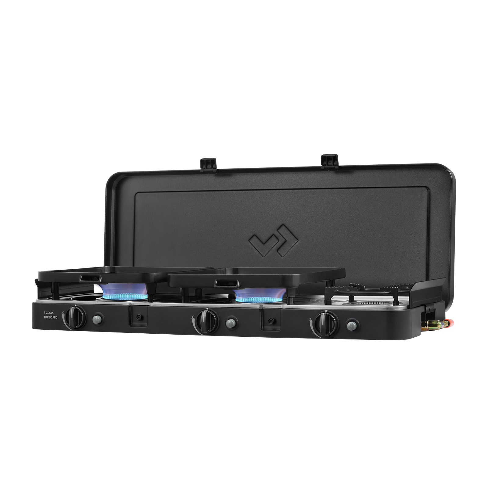 - Kompakter, leistungsstarker Gaskocher mit 3 separat steuerbaren Turbo-Gasbrennern