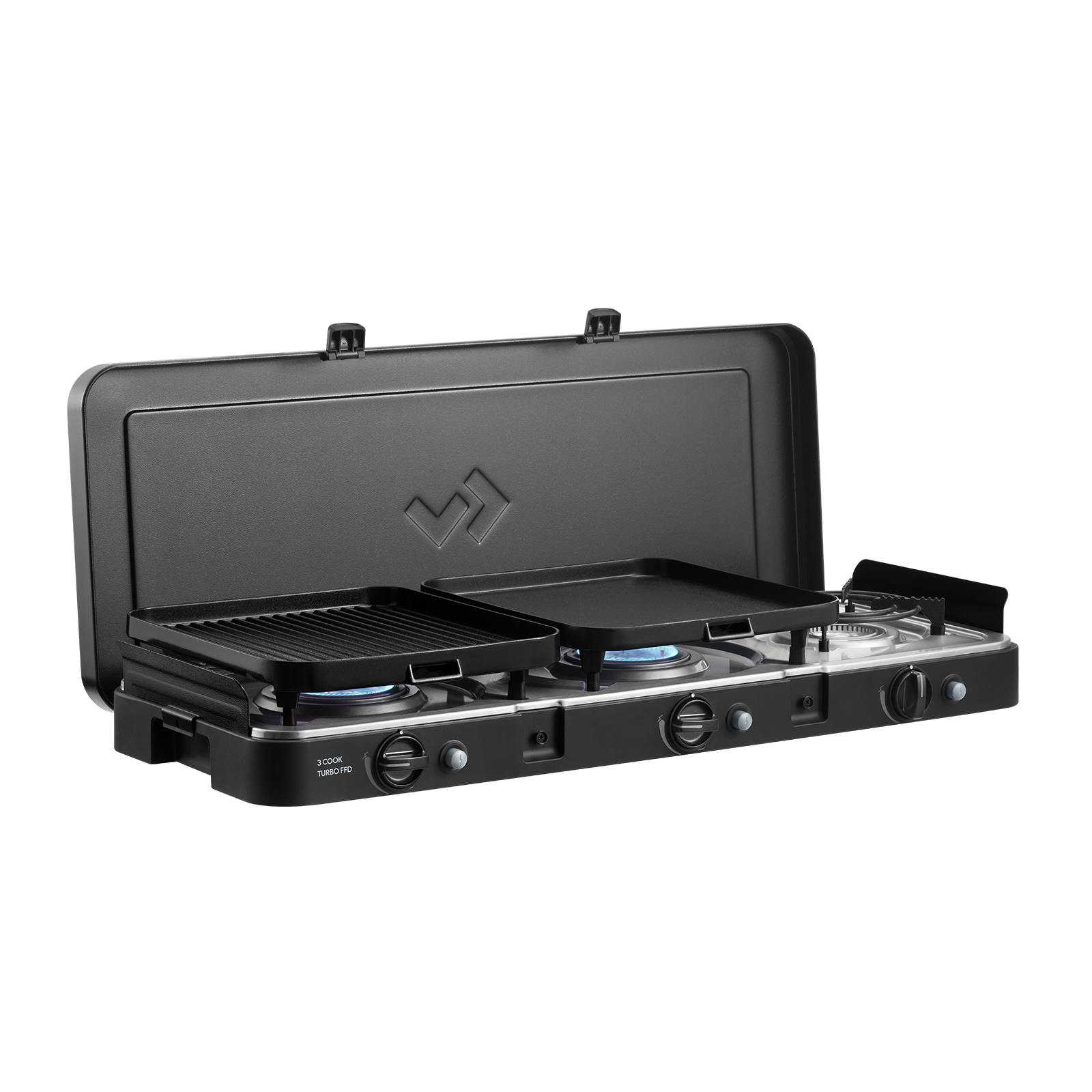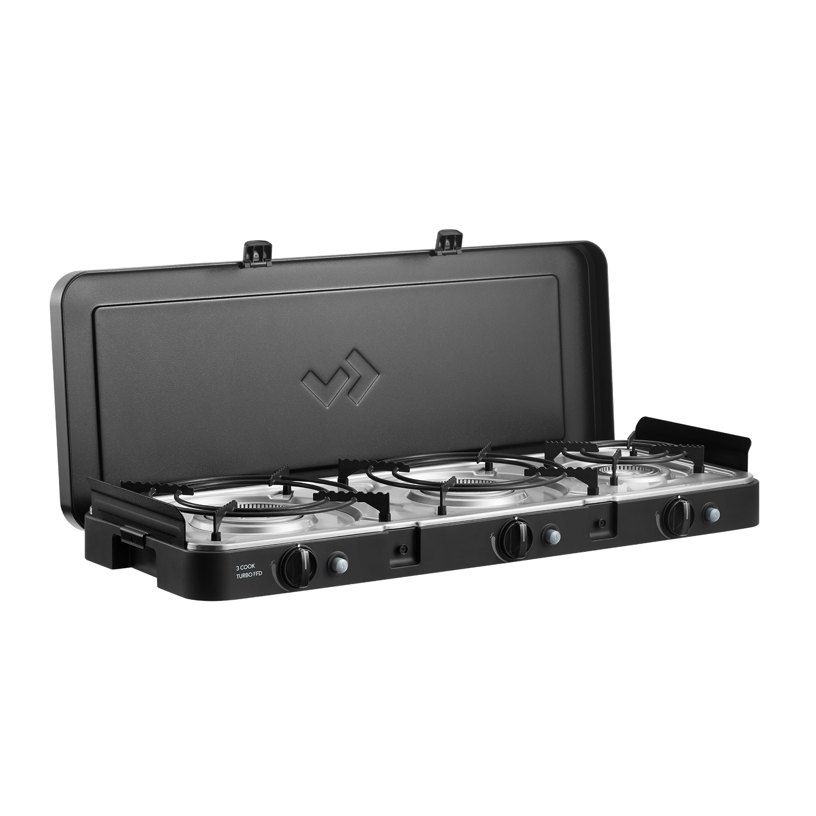 - Kompakter, leistungsstarker Gaskocher mit 3 separat steuerbaren Turbo-Gasbrennern