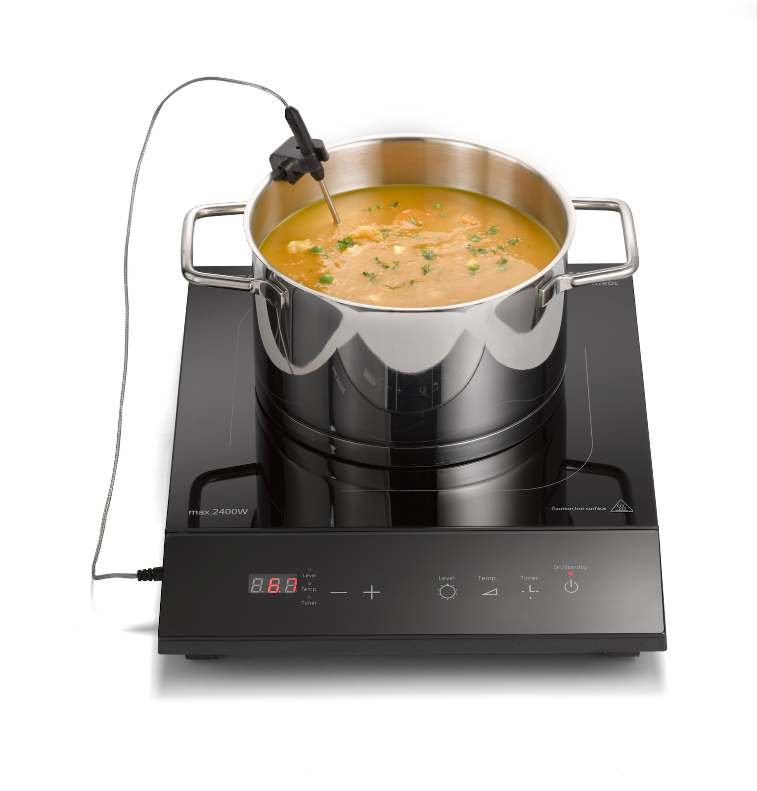 Die neuentwickelte TC 2400 Induktionskochplatte mit Temperaturkontrolle ergänzt das Induktionskochen mit Thermo Control-Thermometer für eine exakte Temperatursteuerung - Schnell, sicher, energiesparend und perfekt kontrolliert.