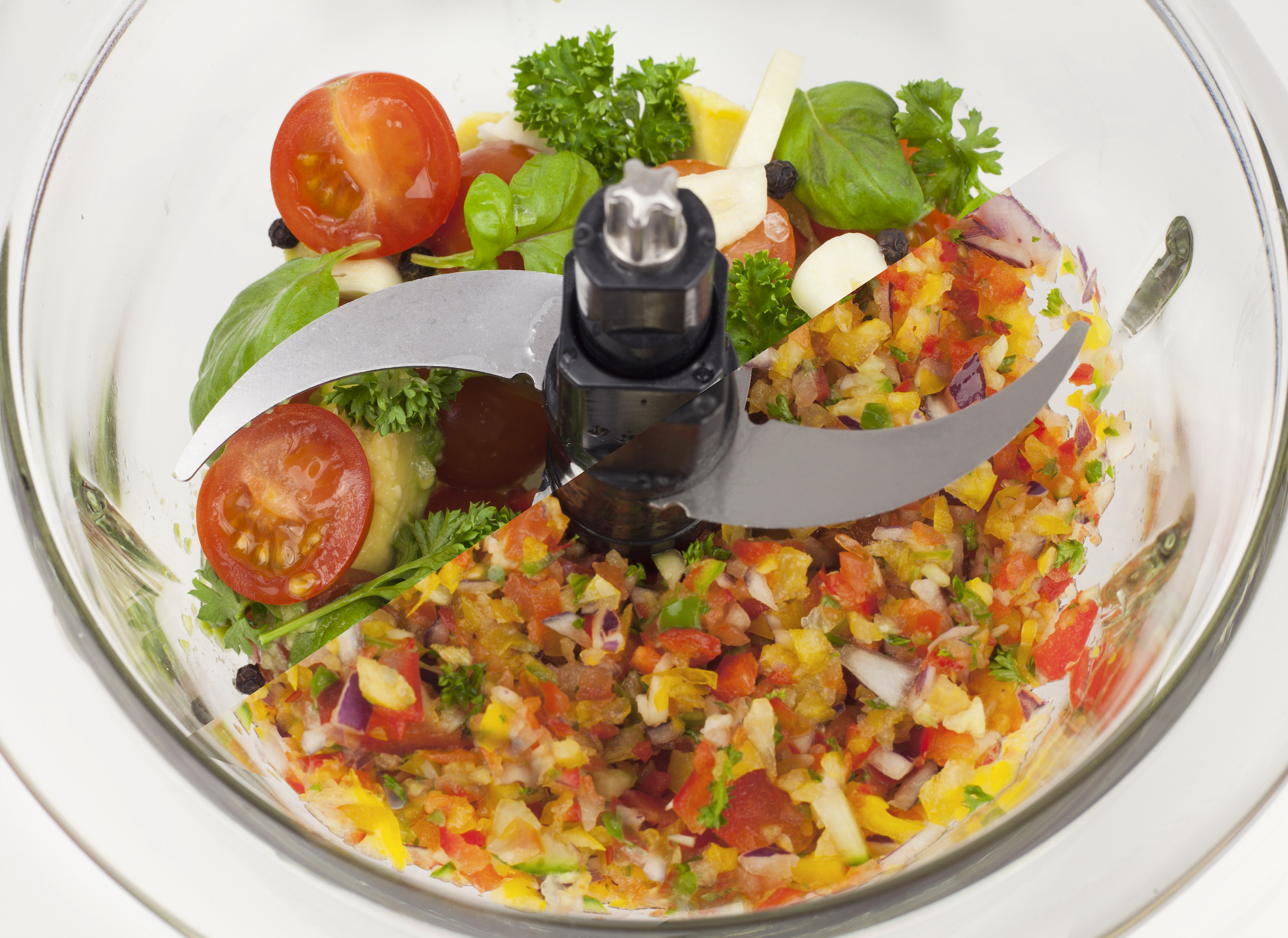- Zerschneidet und zerkleinert Obst, Gemüse, Zwiebeln, Knoblauch, Fleisch, Fisch, Nüsse etc.
