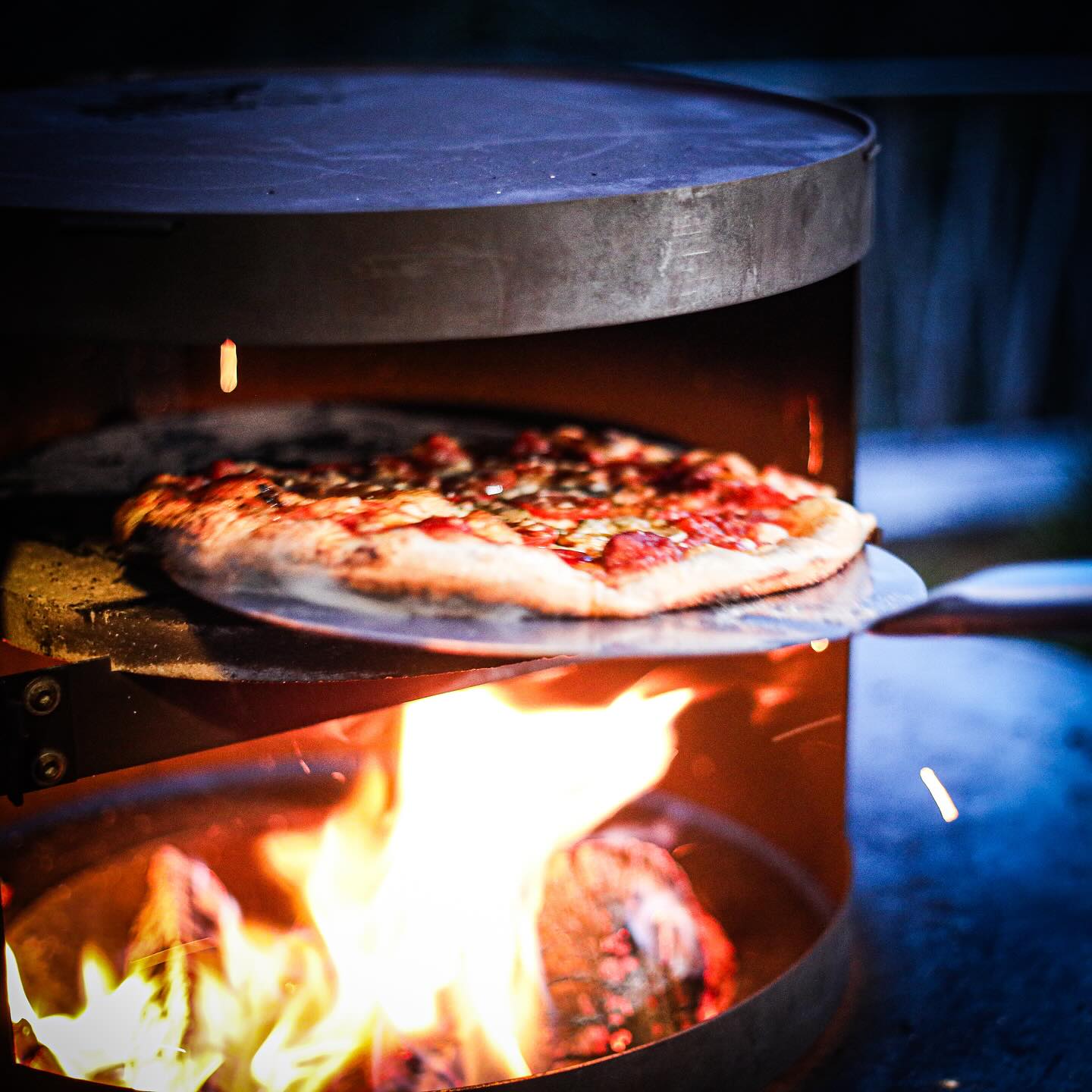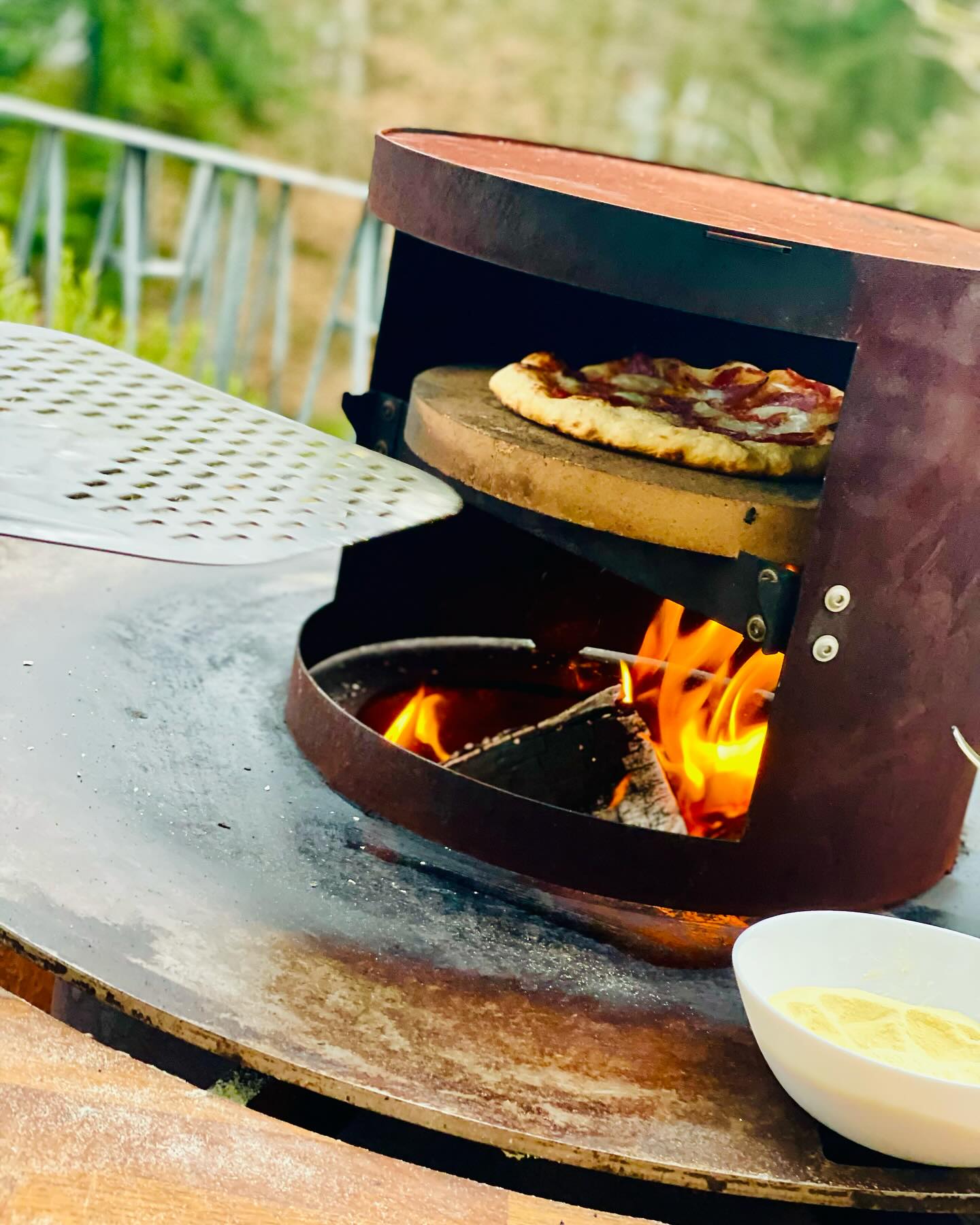 - 1x DEINWERK Pizzaofen für Feuerplatte mit Smoker Funktion aus Cortenstahl mit Eichenholzgriff