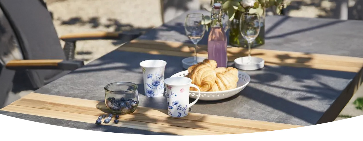 - Tischplatte aus Deropal (Höhe 0,8 cm) oder recyceltem Teakholz (Höhe 3cm)