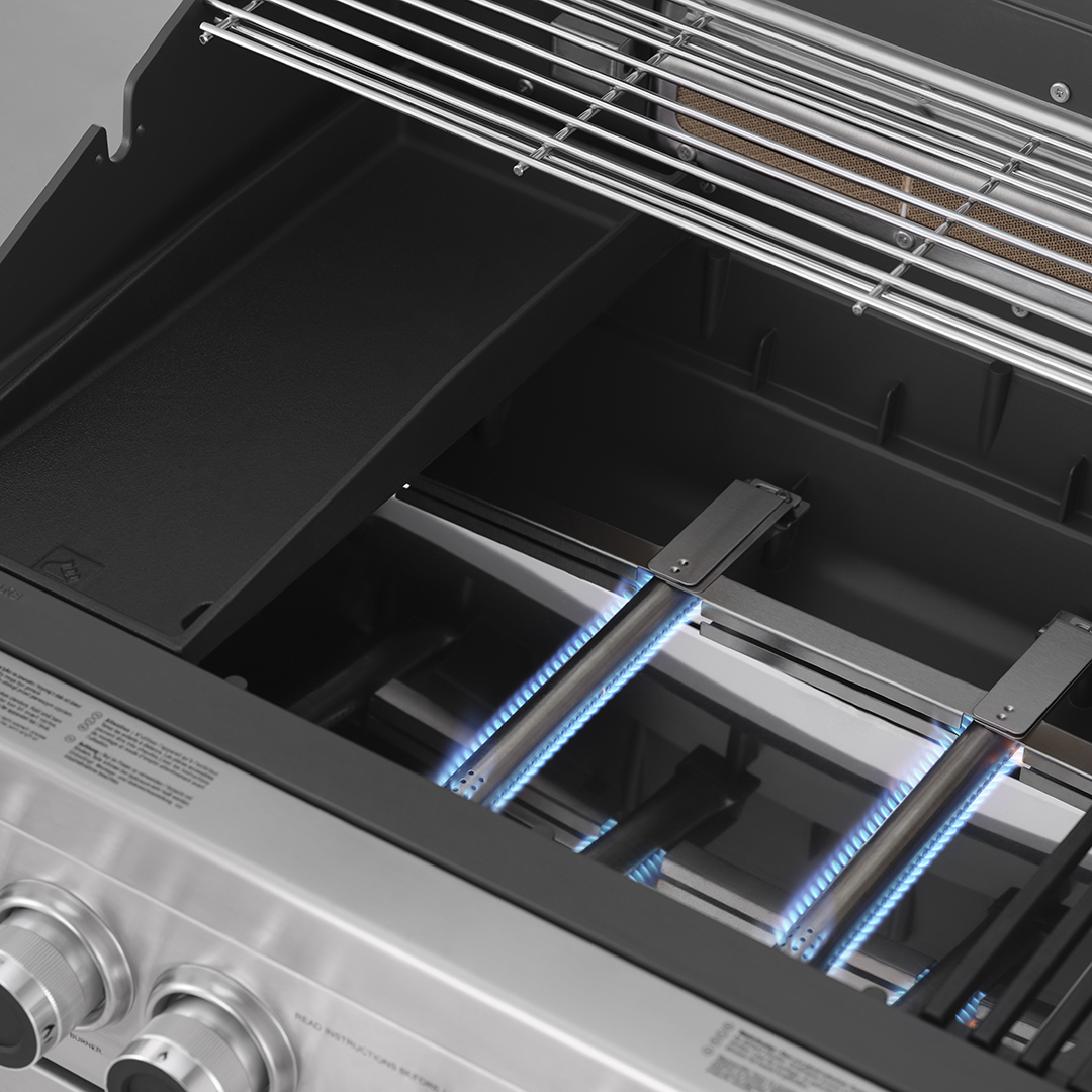 Ein wahres Kraftpaket! Die Grillfläche des Grandpro Pro Elite Trolley besteht aus 3 Gussrosten, sowie einer Grillplatte aus Gusseisen. Da alle Elemente gleich groß sind, können Sie die Grillfläche immer nach Ihren Wünschen aufteilen. Über der Grillfläche befindet sich ein praktischer Warmhalterost, sowie der Heckbrenner. Dieser dient für schonend gegarte Speisen auf einer optionalen Rotisserie, wie zum Beispiel Geflügel, Rollbraten oder ähnliches. Durch die Hitze von hinten wird Fettbrand direkt vermieden und Sie können trotzdem knusprige Speisen genießen. Unter der Grillfläche verbergen sich die 4 Edelstahl-Hauptbrenner und Flammenschutzbleche aus Edelstahl.
