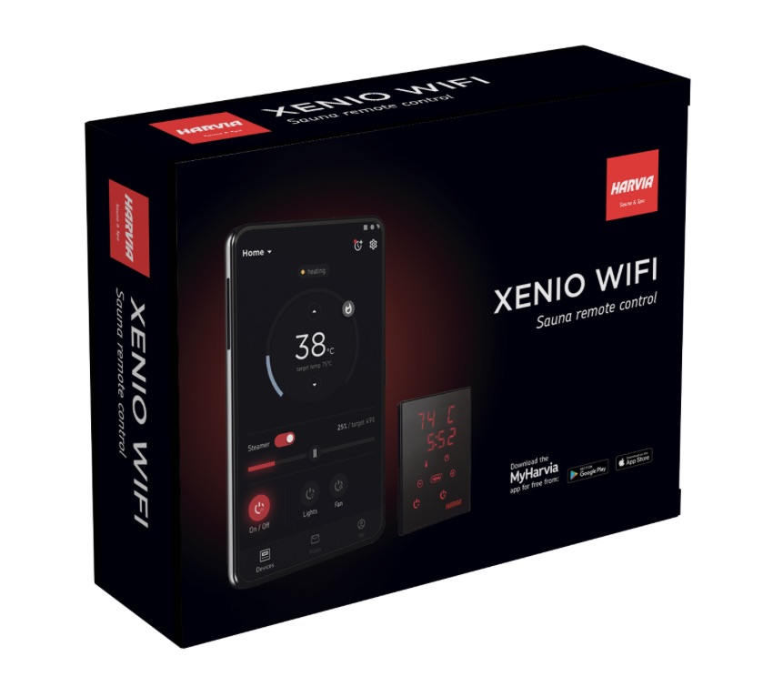 Das Xenio-WiFi-Zubehörpaket von Harvia umfasst das WiFi-fähige Bedienfeld „Xenio“ von Harvia und den SAB00103-Türsensor von Harvia.