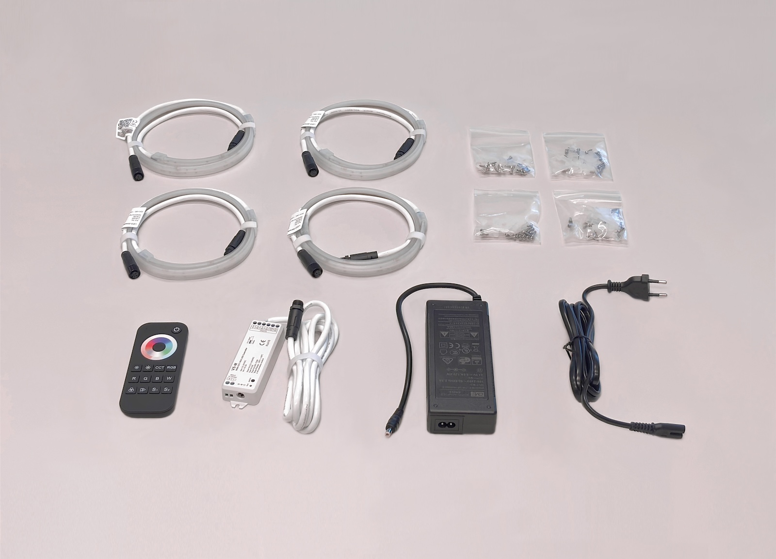 - Bestehend aus 4 LED-Streifen, Netzgerät, Controller mit Fernbedienung und Anschlusskabel