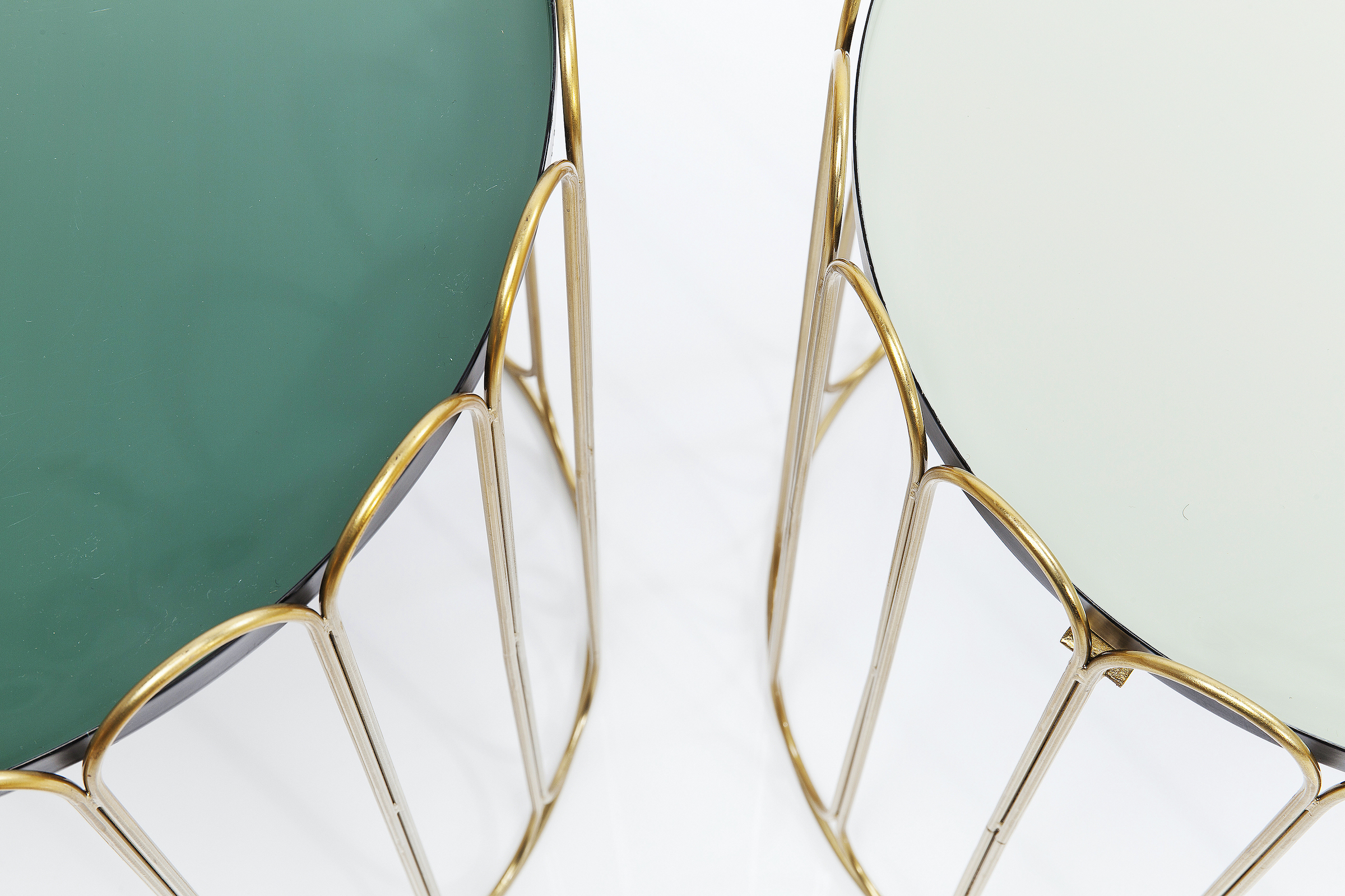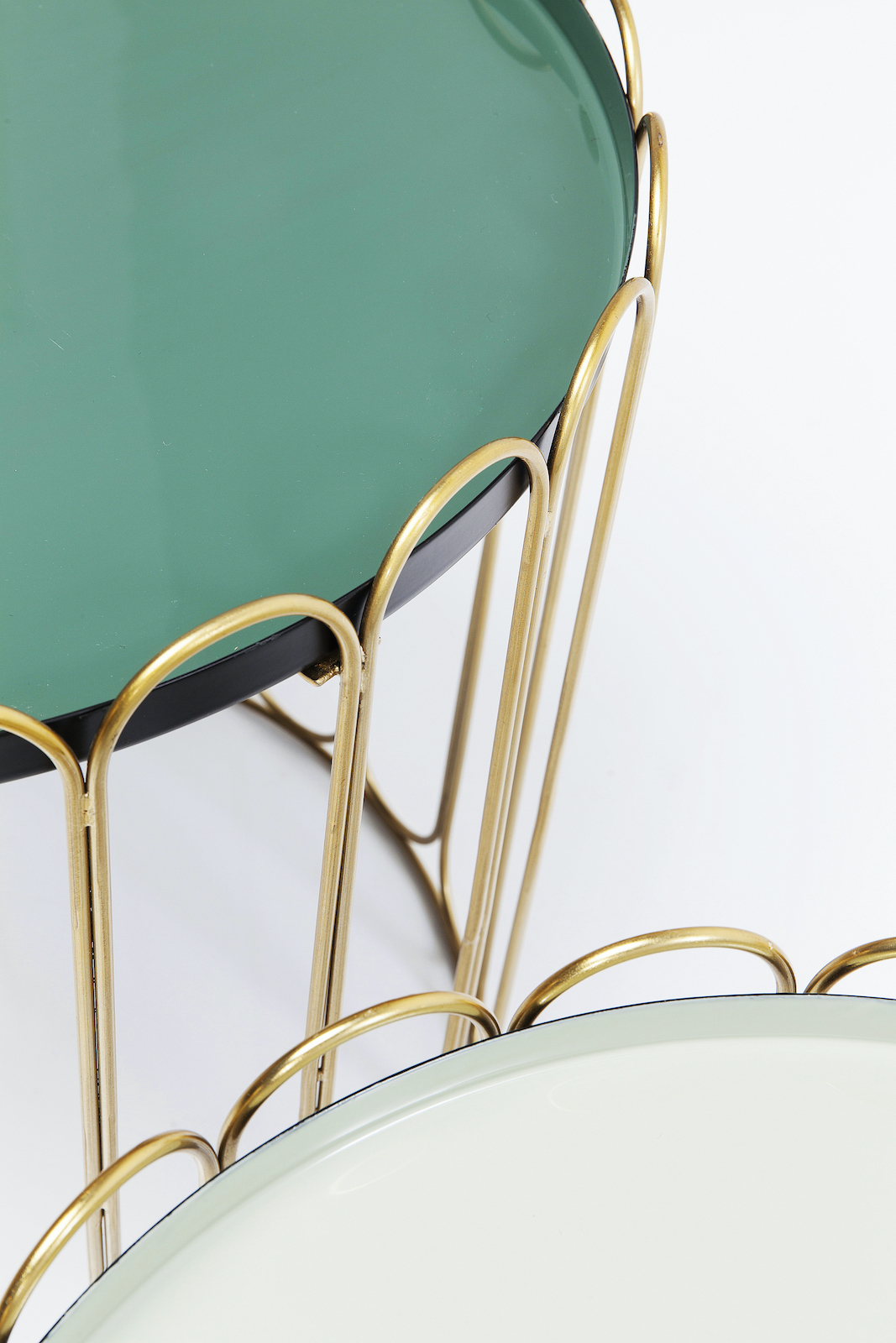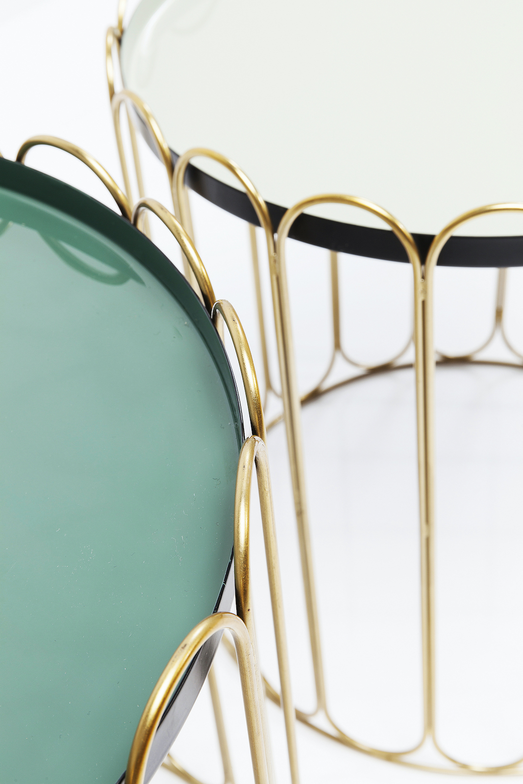 Beistelltische sind Alleskönner: Für spontane Partys, liebe Gäste, Serien-Marathons mit feinen Snacks und - wenn sie so aussehen wie diese - um jedem Raum auf ganz simple Art ein elegantes Style-Upgrade zu schenken. Das grafisch gebogene Gestell und die emaillierten Oberflächen der Tischplatten könnten auch gut ins glamouröse Beverly Hills der sechziger Jahre passen.