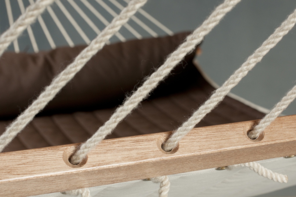 Die Spreizstäbe aus hochwertigem Kiefernholz öffnen die Liegefläche komfortabel für eine oder mehrere Person. Die hohe Anzahl ihrer Aufhängeschnüre garantiert eine optimale Gewichtsverteilung. Tipp: Stabhängematten immer schön straff aufhängen!