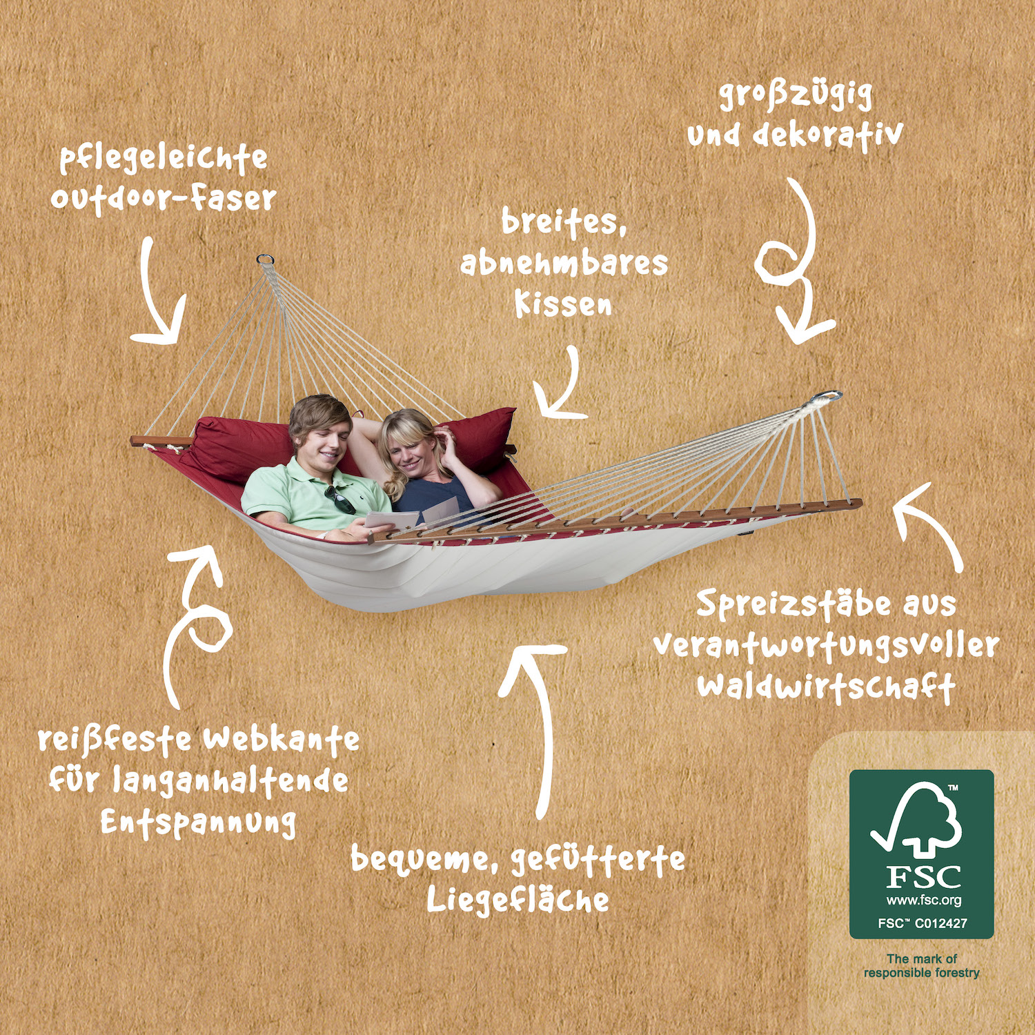 Sie bietet durch die gepolsterte Liegefläche einen hohen Liegekomfort und ist durch ihre Wetterbeständigkeit besonders für den Gebrauch in der freien Natur geeignet. Sie ist aus HamacTex hergestellt, einer speziell für Hängematten entwickelten Polypropylen-Faser. Diese ähnelt der Baumwolle, ist jedoch wetterbeständiger und trocknet schneller. Durch verstärkte Webkanten ist sie besonders reißfest.