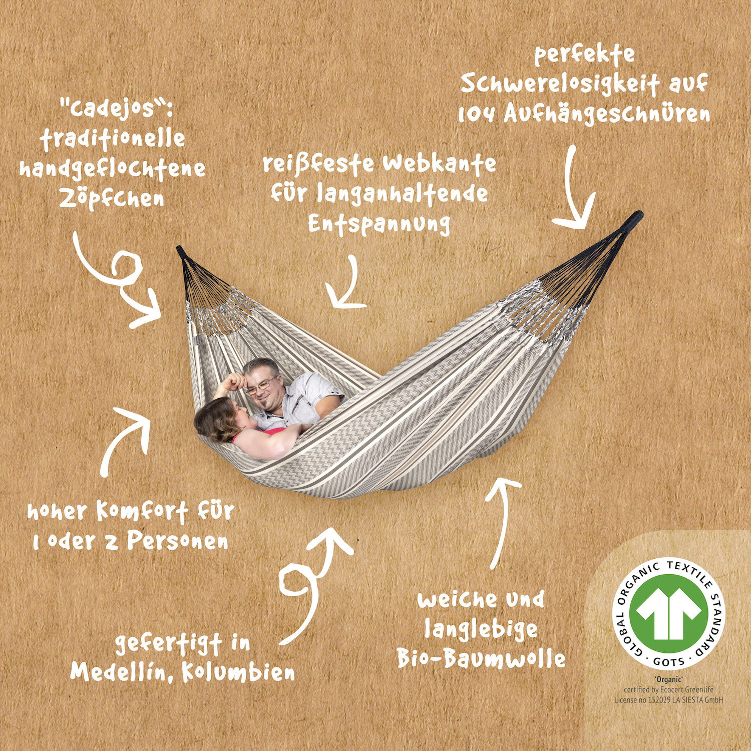 Eigenschaften "La Siesta Kingsize-Hängematte FLORA zebra beige Doppelhängematte XXL aus Bio-Baumwolle"