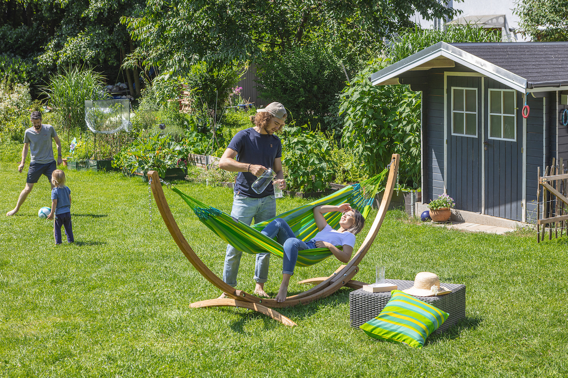 Die wetterfeste Single-Hängematte BRISA von La Siesta lädt zum Entspannen ein.