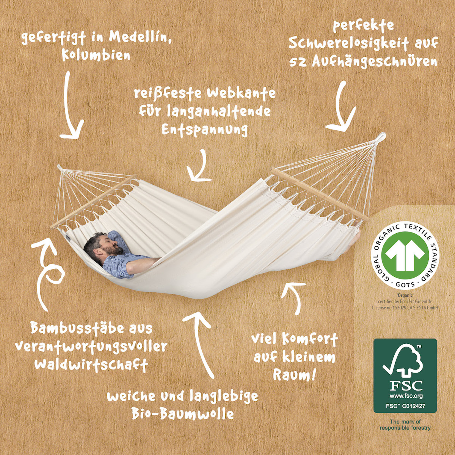 Eigenschaften "La Siesta Single-Stabhängematte FLORENCIA latte creme Einzel-Stabhängematte aus Bio-Baumwolle"