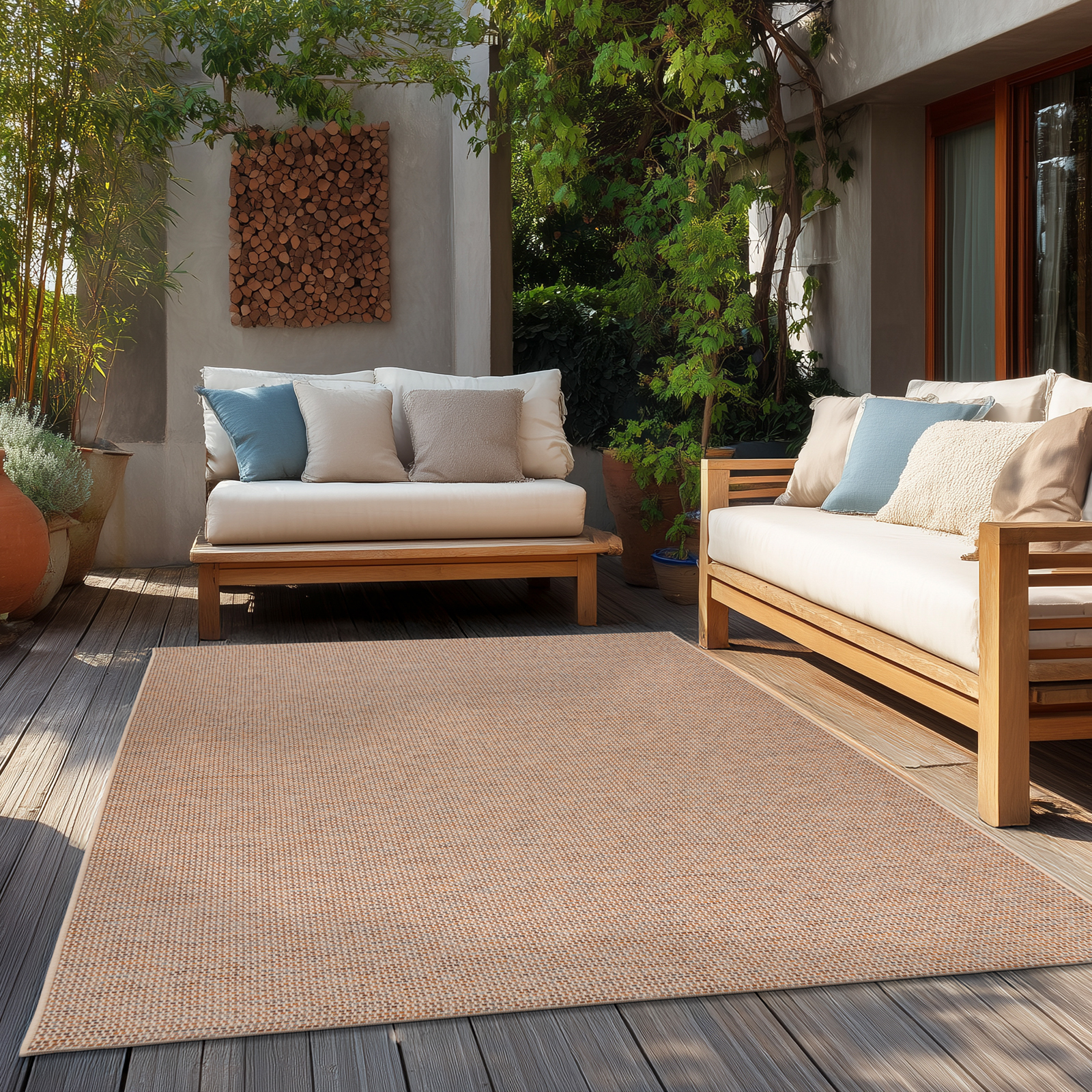 Gefertigt aus strapazierfähigem, pflegeleichtem Material überzeugt dieser Teppich durch seine robuste und langlebige Qualität. Die flachgewebte Struktur sorgt für eine angenehme Haptik und eine stabile Oberfläche, die auch bei stärkerer Beanspruchung formschön bleibt. Dank seiner widerstandsfähigen und leicht zu reinigenden Eigenschaften eignet sich der Teppich ideal für Terrasse, Balkon oder Wintergarten und setzt zugleich auch im Innenbereich einen stilvollen, frischen Akzent.
