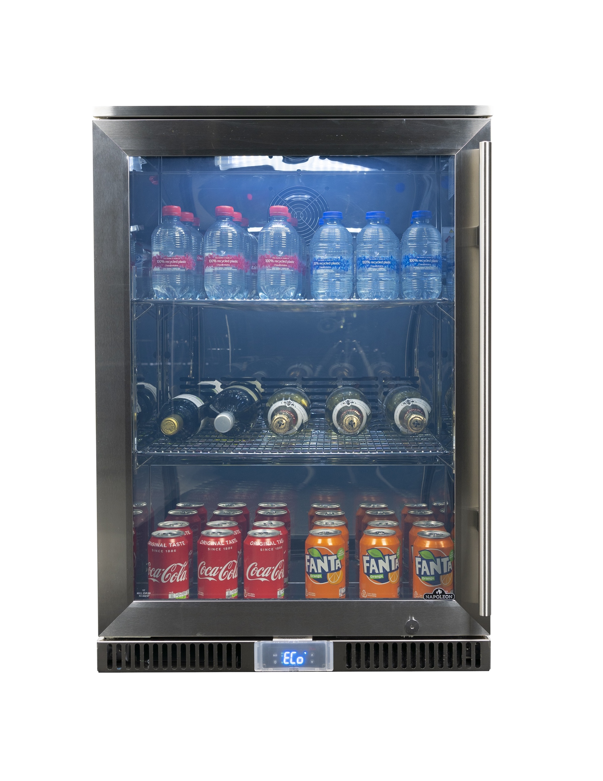 Eintüriger Napoleon Getränkekühler für den Außenbereich mit einem Fassungsvermögen von 135 Litern. Mit nach links öffnender Tür. Funktioniert bei Temperaturen von -5 bis 40 Grad Celsius und besitzt ein wasserdichtes IP24-Design.