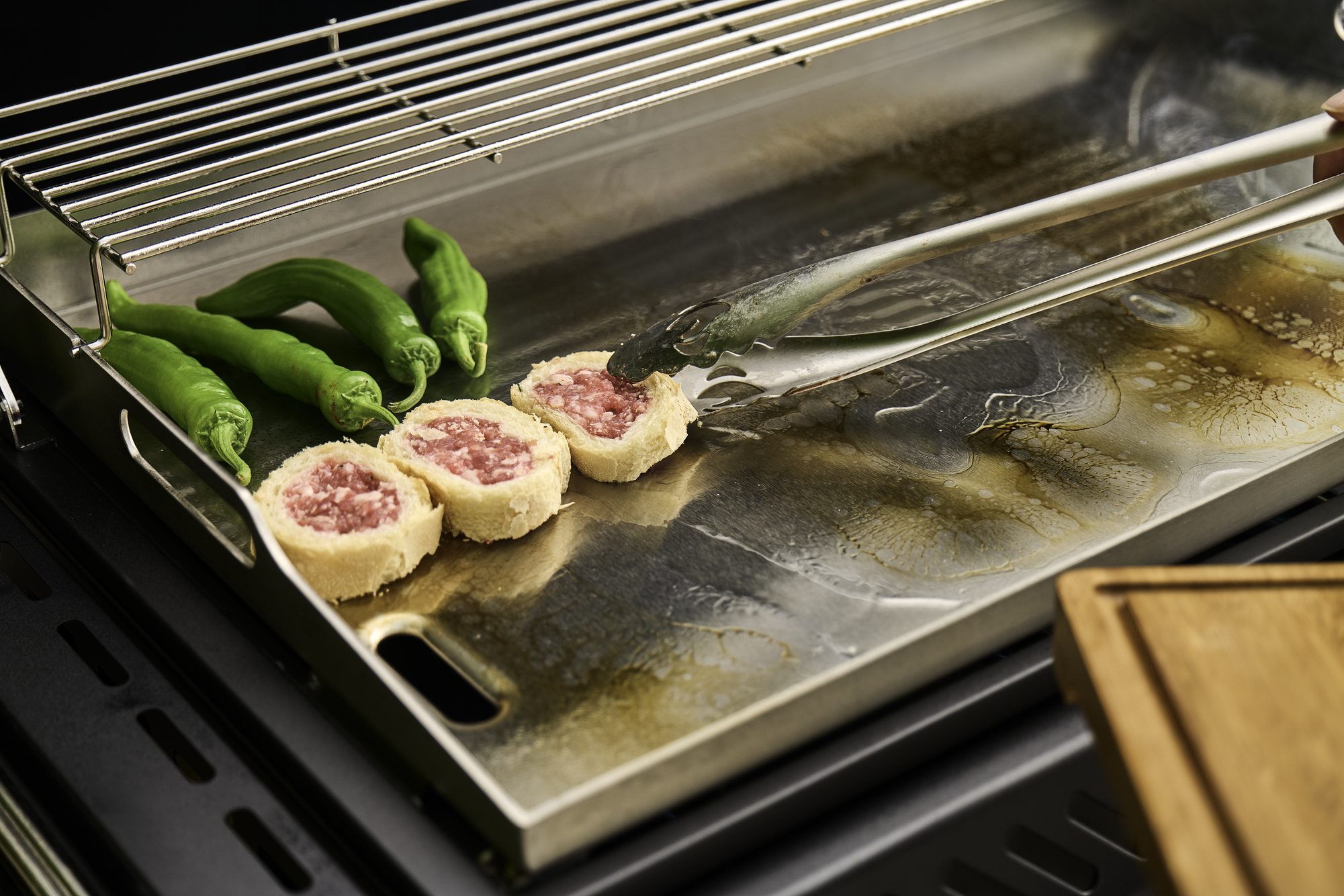 - Dreiseitig abgeschrägte Edelstahlkante zum einfachen Wenden und Anheben von Grillgut