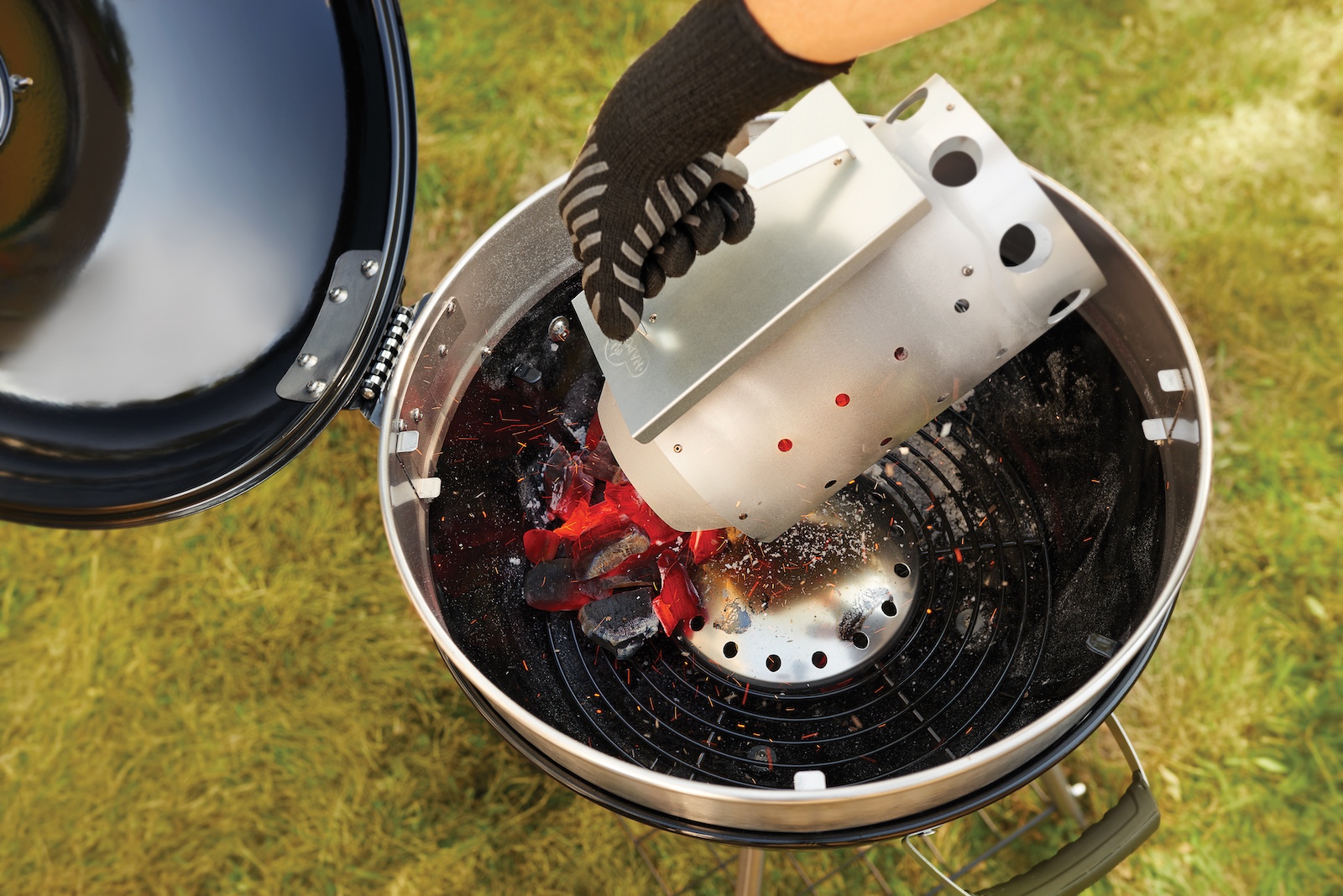 - Präzises Ausschütten der glühenden Holzkohle & Briketts
