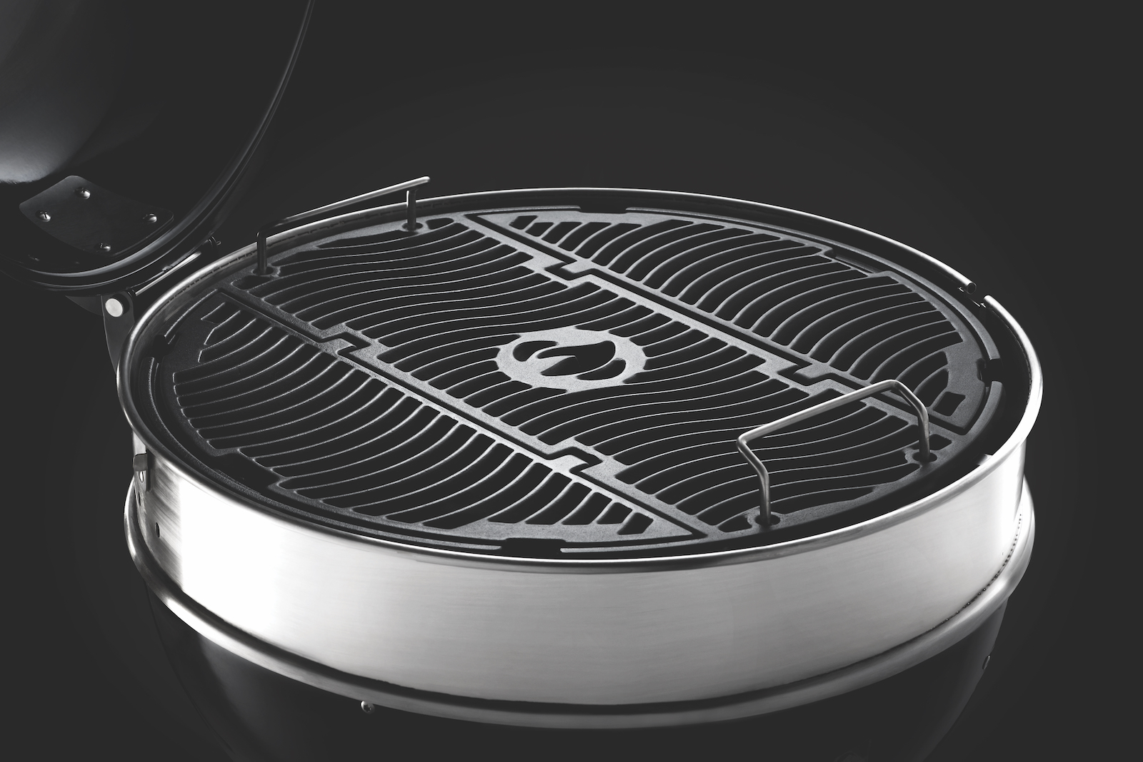 Der Erweiterungsring aus Edelstahl ist für Drehspießgerichte geeignet und verfügt über Türen, die die Öffnungen für den Spieß abdecken. Integrierte Türen für Temperaturfühler sorgen dafür, dass Sie den Garvorgang genau steuern können. Die überaus stabile porzellanbeschichtete Stahlkonstruktion ist gegen Verschleiß gewappnet. Durch den klappbaren Deckel haben Sie Zugriff auf die gesamte Kochfläche.