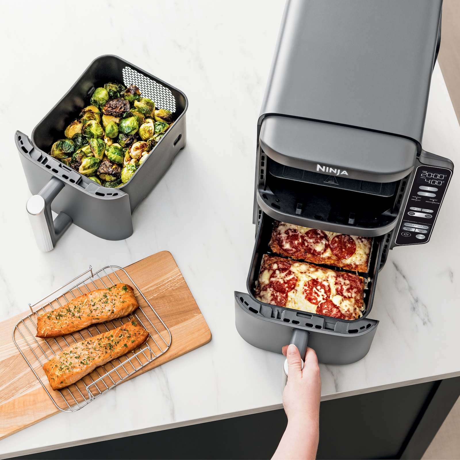 Sie wünschen sich eine größere Heißluftfritteuse in Ihrer Küche, haben aber nur wenig Platz auf der Arbeitsfläche? Wir präsentieren die Ninja Double Stack XL 2-Ebenen Heißluftfritteuse vor. Diese vertikale Heißluftfritteuse verfügt über zwei übereinander gestapelte Schubladen, die weniger Platz auf Ihrer Arbeitsfläche benötigen als herkömmliche Heißluftfritteusen. Mit einer Höhe von 38,5 cm passt sie auch unter Schränke.