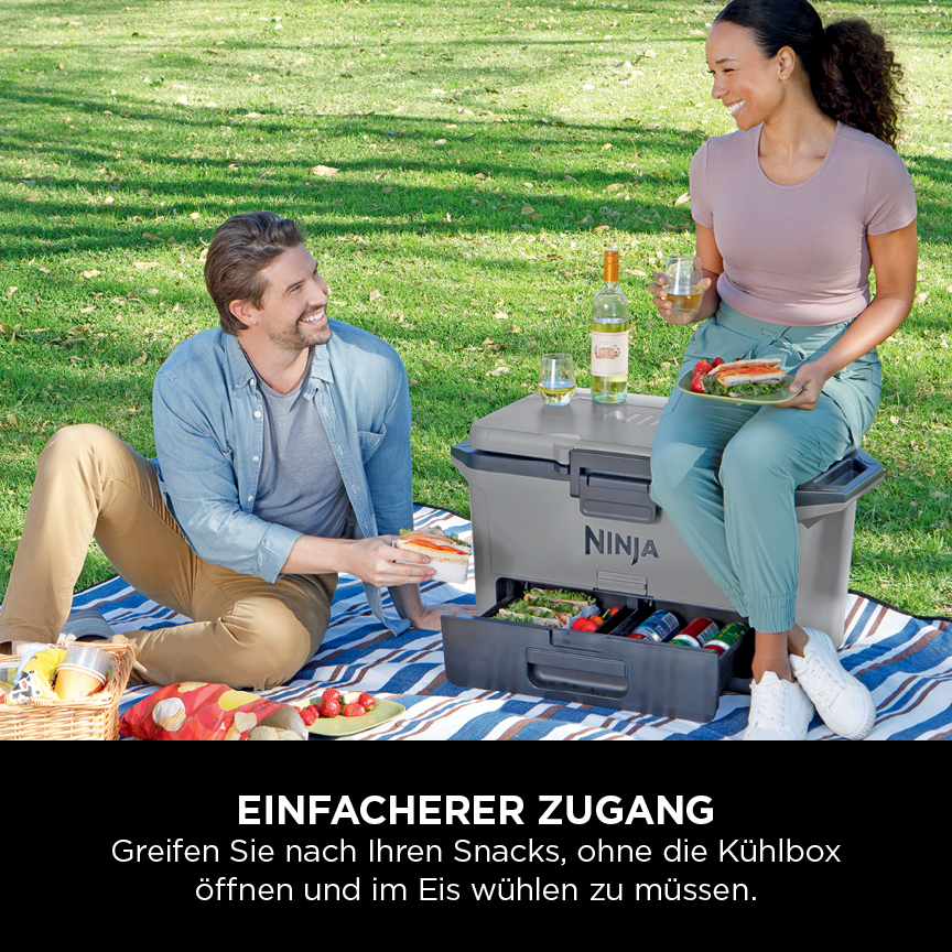 Lernen Sie die Ninja FrostVault kennen, die Kühlbox mit erstklassiger Eisspeicherung und trockener Lagerung bei Kühlschranktemperatur für mehrere Tage. Die Ninja Kühlbox hält das Eis bis zu 6 Tage lang kalt. Perfekt für Campingausflüge, Picknicks und alle weiteren Outdoor-Abenteuer. Die große Kapazität von 47 l bietet Platz für bis zu 80 Dosen ohne Eis oder 45 Dosen mit Eis oder 50 Flaschen. Ausreichend Platz für all Ihre Lieblingsgetränke, von Bier oder Wein bis zu Wasser und Softdrinks.