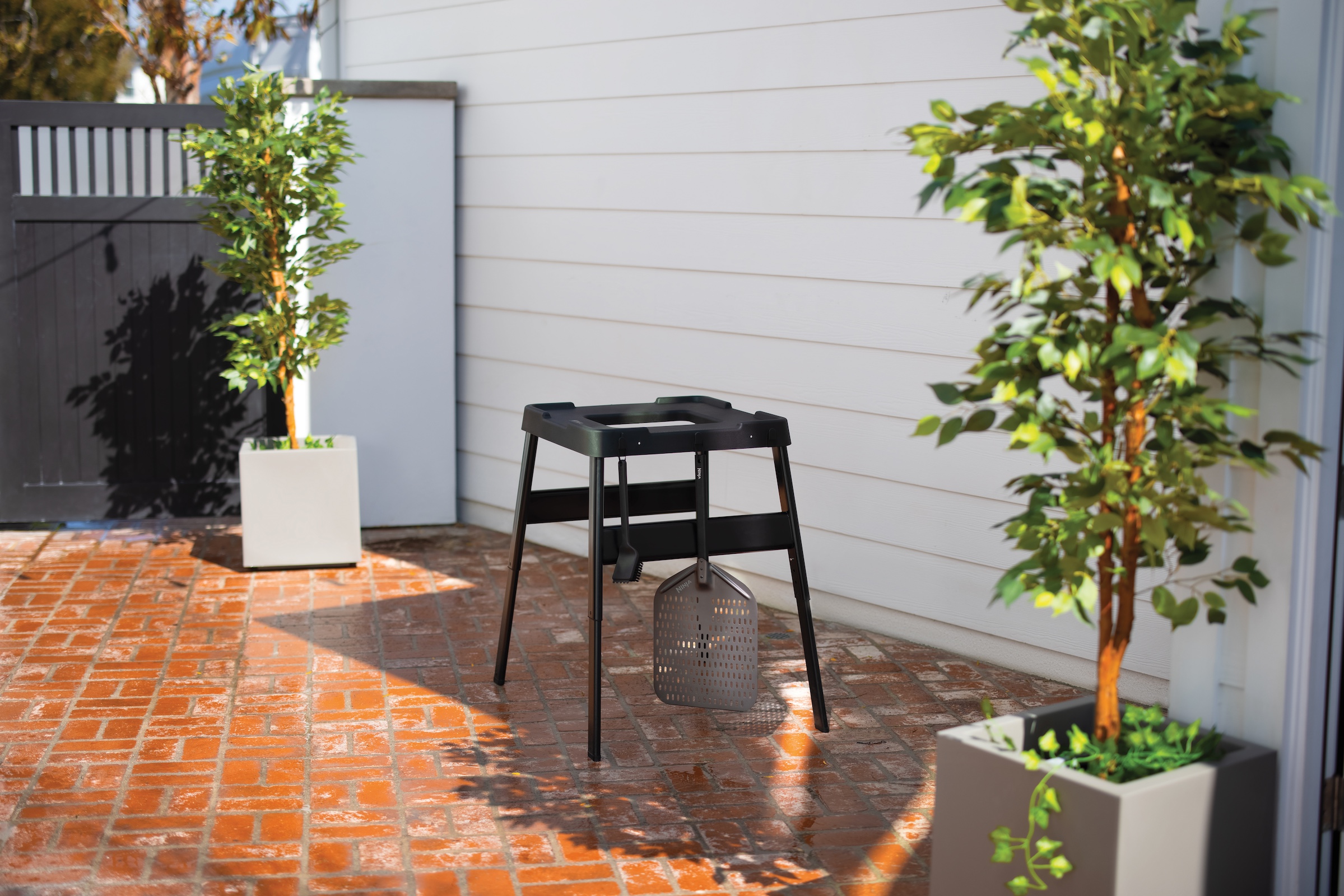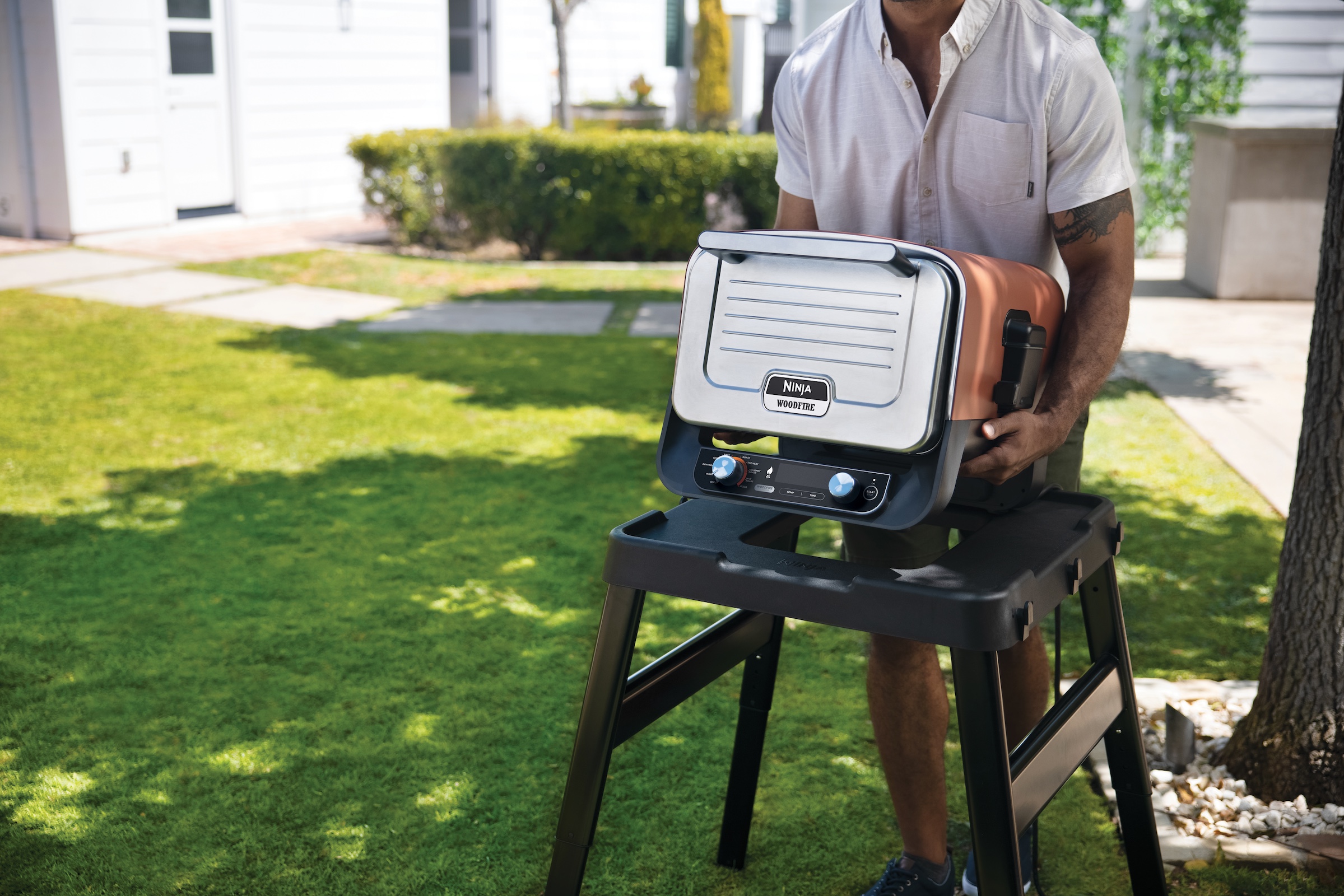 Mit diesem robusten höhenverstellbaren Ständer und Seitentisch für Ihren Ninja Woodfire Outdoor-Ofen und Grill bringen Sie Ihre Outdoor-Küche auf ein neues Niveau.