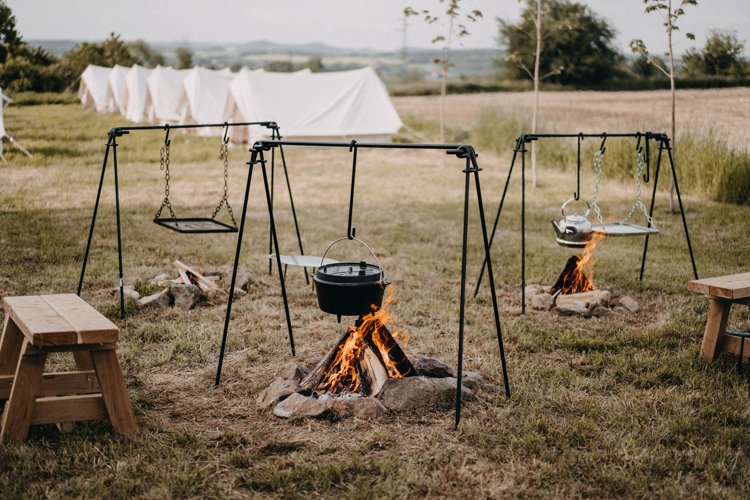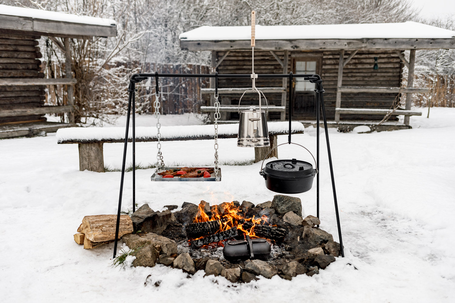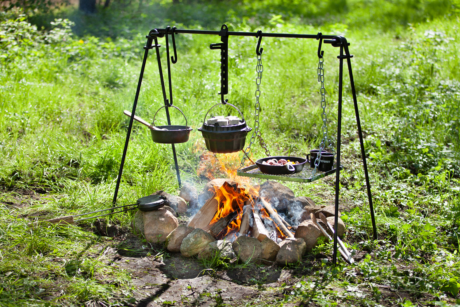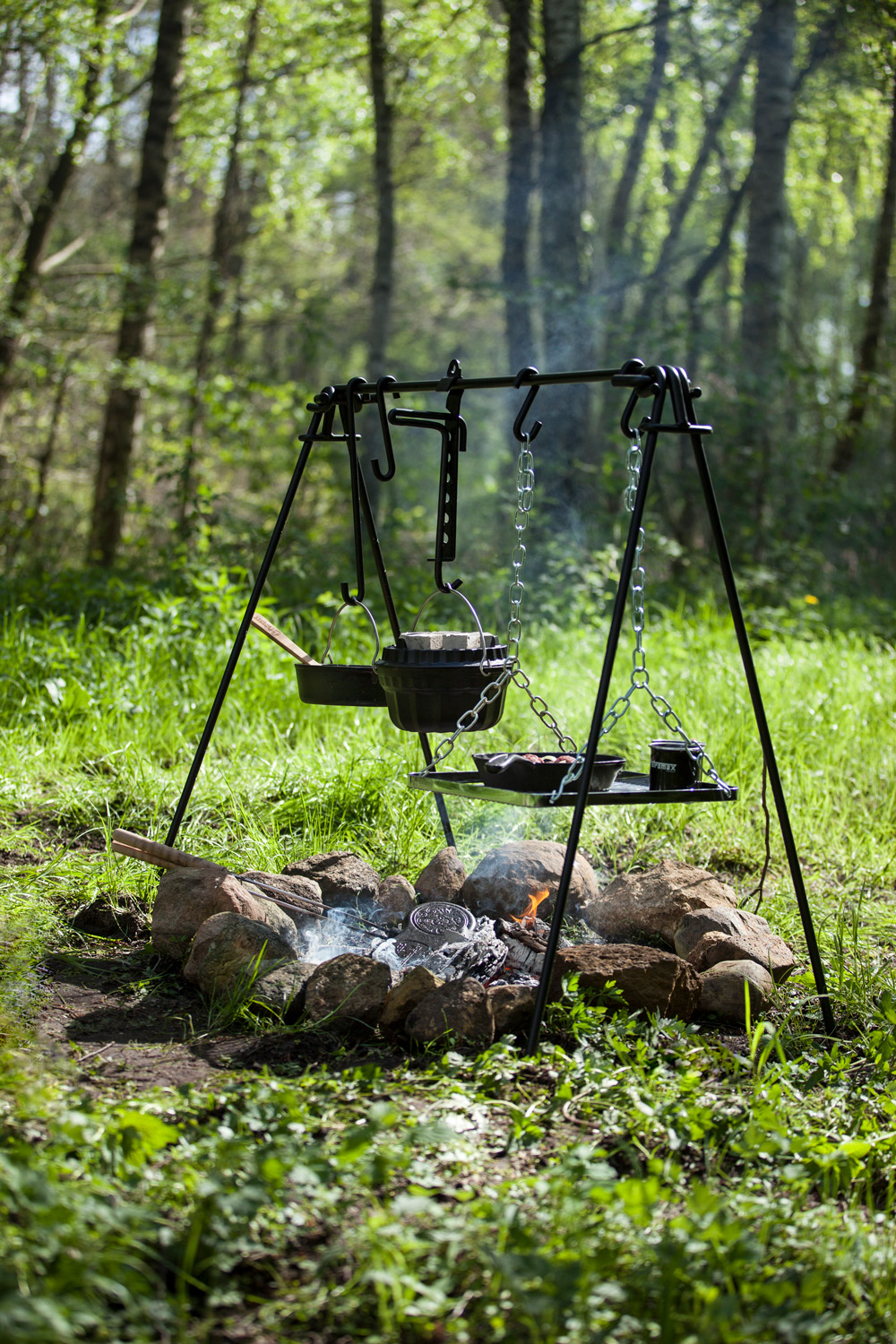 Die Feuerbrücke steht dank der Ösen-Konstruktion sicher auf vier Beinen und ist in Kürze einsatzbereit. Dank der 115 cm langen Querstange können Sie Ihre Camping-Küche über einer oder mehreren Feuerstellen aufbauen. Der Grillrost verfügt über eine in der Länge flexibel einstellbare Kettenaufhängung. Die umlaufende Umrandung hält das Grillgut sowie Pfannen und Co. sicher an ihrem Platz.