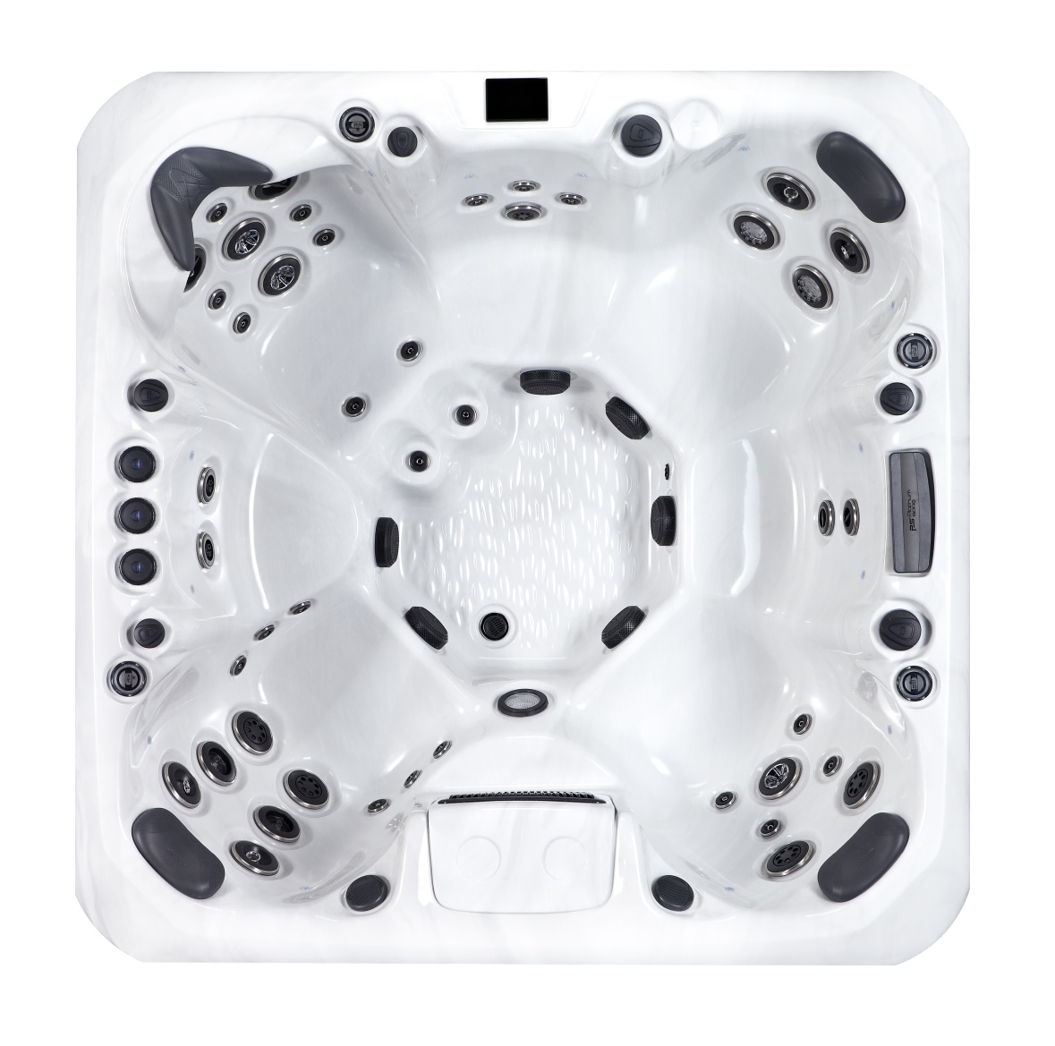 Allsitzer-Design für bis zu 7 Personen, mit drei Farboptionen für die Schale und einer für die Seitenwände. Ausgestattet mit 48 Düsen mit unterschiedlichen Formationen und dem Ozon-Wasserklärer, um Ihr Wasser sauber zu halten.