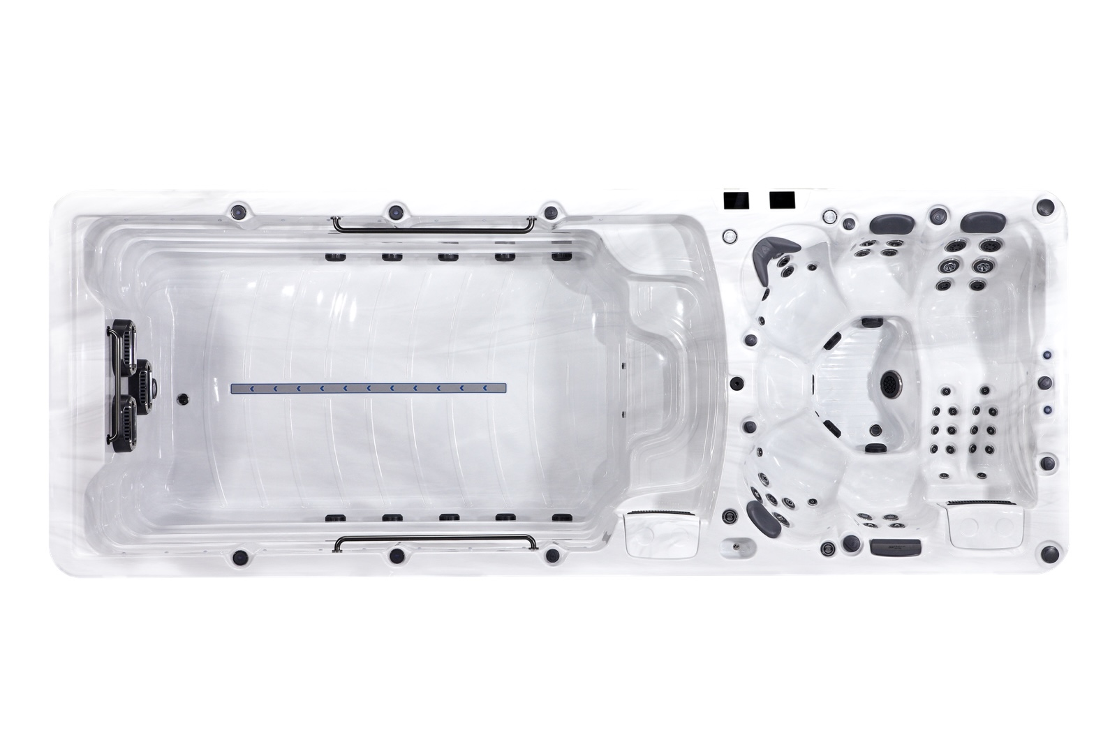 Der Helios Swim Spa ist ein vollständig geteilter Whirlpool, der eine vollständige Temperaturkontrolle beider Bereiche ermöglicht. Dies ermöglicht ein wärmeres, beruhigendes Hydrotherapie-Erlebnis im Spa-Bereich, während im Schwimmbereich eine etwas kühlere Temperatur für das Training beibehalten wird.