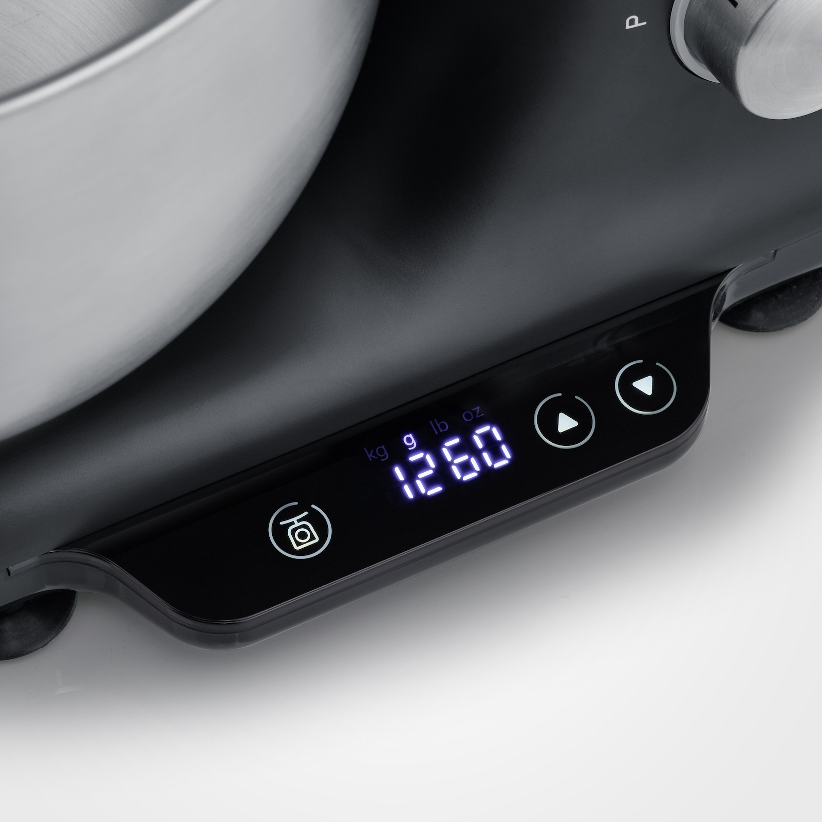 Der Allrounder mit ordentlich Power: 1.000 Watt bringen ordentlich Kraft mit, auch für schwierige Teige. Die Saugnäpfe unter der robusten Maschine sorgen dabei für einen sicheren Stand. Über 8 Leistungsstufen lässt sich die Leistung der Küchenmaschine flexibel regulieren. Zwei praktische Display-Modi erleichtern die Arbeit: Die Küchenmaschine stoppt nach der voreingestellten Zubereitungszeit oder zeigt die vergangene Zeit während der Zubereitung an. Die integrierte Waage mit Digitalanzeige zeigt Ihnen an, wieviel Masse Sie der Schüssel hinzufügen. So sparen Sie sich das Abwiegen in separaten Schüsseln. Weniger zu spülen, einfach praktisch zu handhaben.