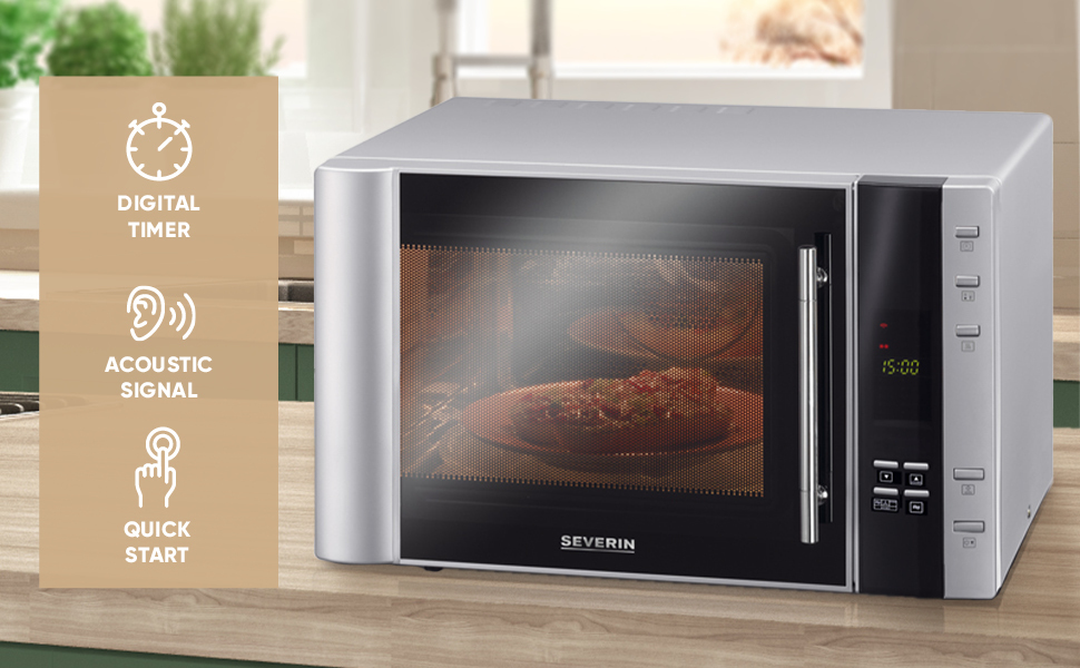 Die drei Funktionen Mikrowelle, Grill und Heißluft sind mit zwei Heizungen getrennt oder kombiniert schaltbar. Sie können fünf verschiedene Leistungsstufen und eine Auftaustufe nach Gewicht und Zeit ebenso auswählen wie zehn verschiedene Automatik-Kochprogramme. Im Garraum aus Edelstahl gelingen Ihnen tolle Menüs und schnelle Gerichte, selbst Ihre Lieblingspizza können Sie mit Heißluft zubereiten.