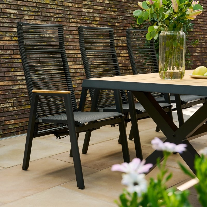 Der Bologna in edlem Grau fügt sich harmonisch in Ihre exklusive Gartenlandschaft ein und verleiht ihr zeitlose Eleganz. Das luftdurchlässige Textilgewebe bietet hohen Sitzkomfort und trocknet schnell – ideal für entspannte Momente im Freien. Die ergonomische Rückenlehne lädt zum stilvollen Zurücklehnen ein.