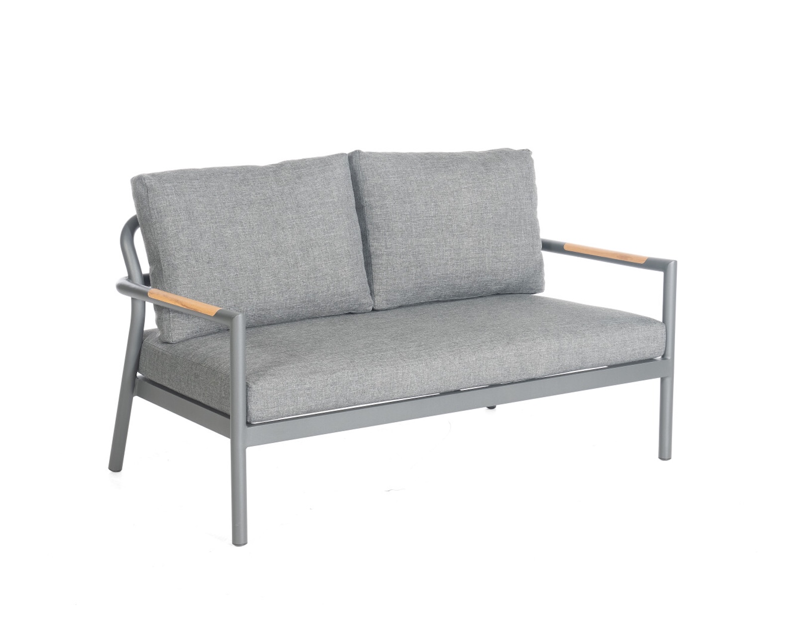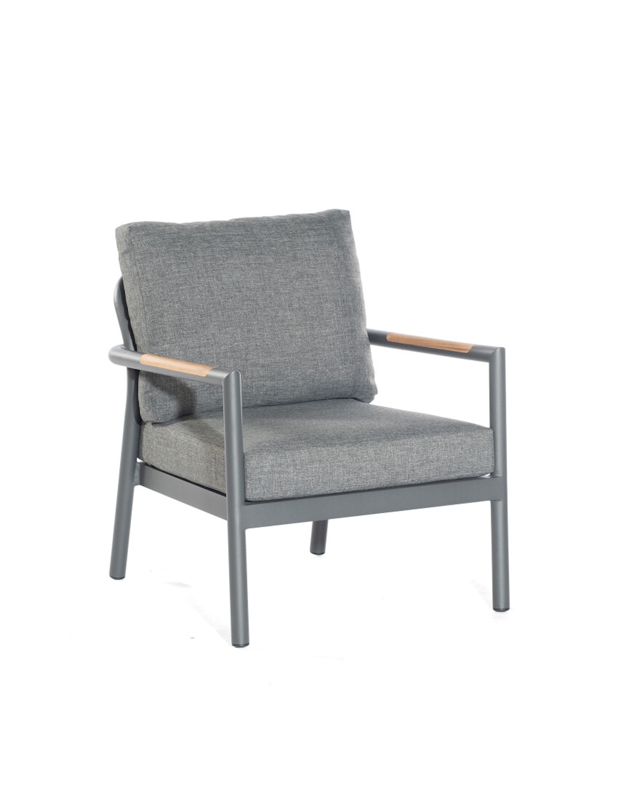 Das robuste Aluminiumgestell ist in einem edlen matt-anthrazitfarbenen Ton gehalten und sorgt für Stabilität sowie eine moderne, klare Linienführung. Besonders stilvoll wirken die eingearbeiteten Teakholzelemente in den Armlehnen, die dem Ensemble eine warme und natürliche Note verleihen und gleichzeitig einen harmonischen Materialkontrast schaffen.