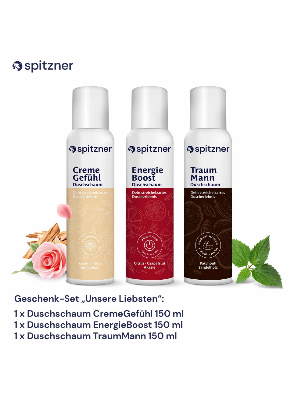 - Set Enthält Duschschaum CremeGefühl 150 ml, Duschschaum EngergieBoost 150 ml, Duschschaum TraumMann 150 ml und Geschenkbox