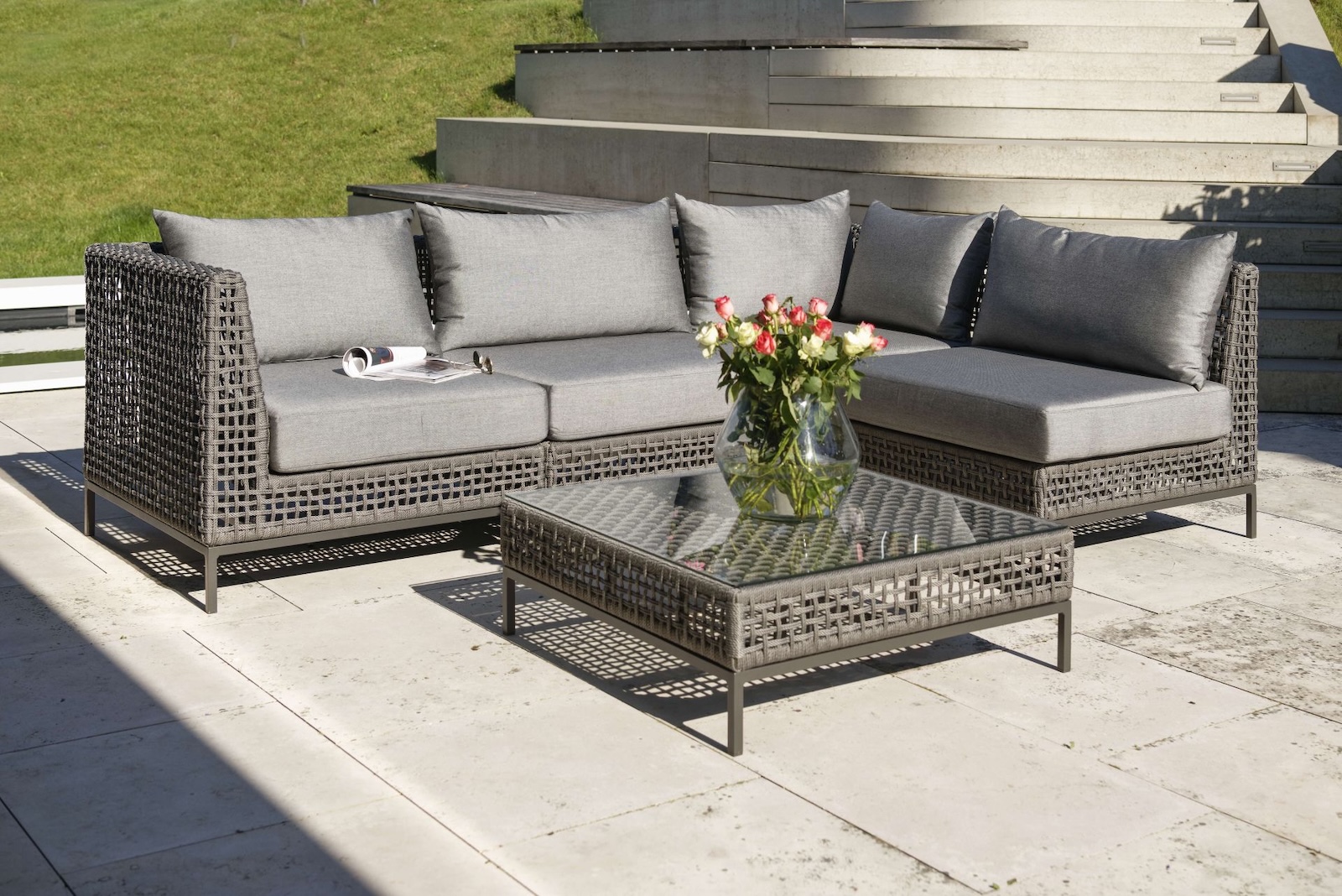 Das Stern Fontana Lounge-Eckelement ist ein elegantes und funktionales Highlight für Ihre Garten- oder Terrassengestaltung. Das robuste Aluminiumgestell garantiert Stabilität und Langlebigkeit, während das moderne Geflecht in Basaltgrau einen stilvollen Akzent setzt.