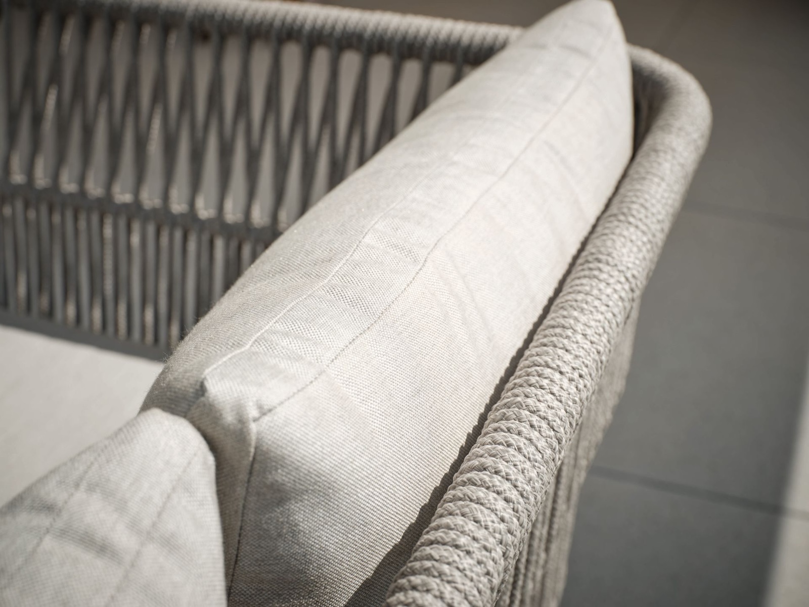 Das charakteristische Designmerkmal der Marla Serie ist die edle Rückenfläche aus geflochtener Kordel (Kordel salt) – ein echter Blickfang, der der Bank eine exklusive Lounge-Anmutung verleiht. Für maximalen Sitzkomfort ist ein passendes Kissenset aus 100 % Polyacryl in graubraun bereits enthalten. Die Bezüge sind pflegeleicht, UV-stabil und bei 30 °C Feinwäsche waschbar.