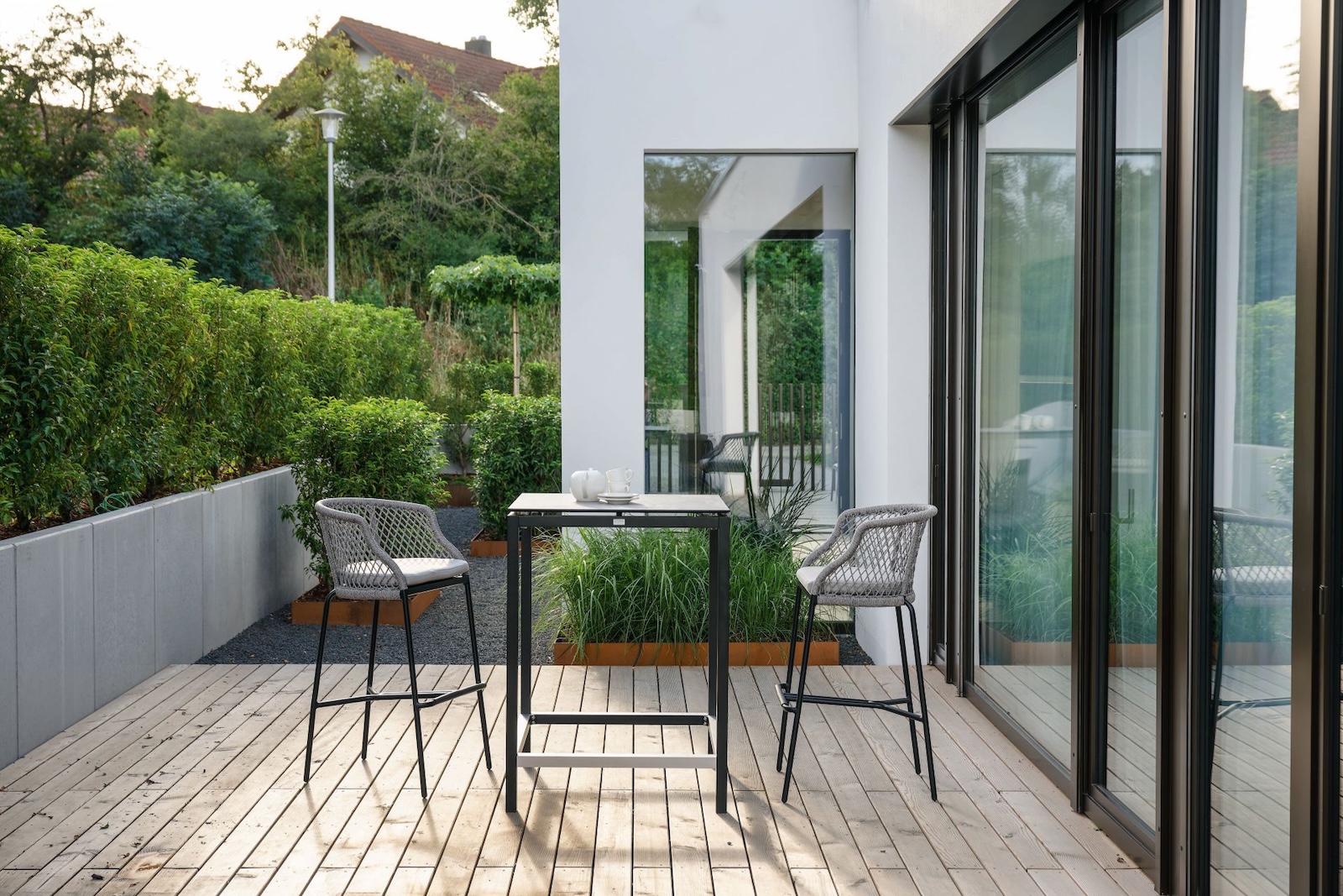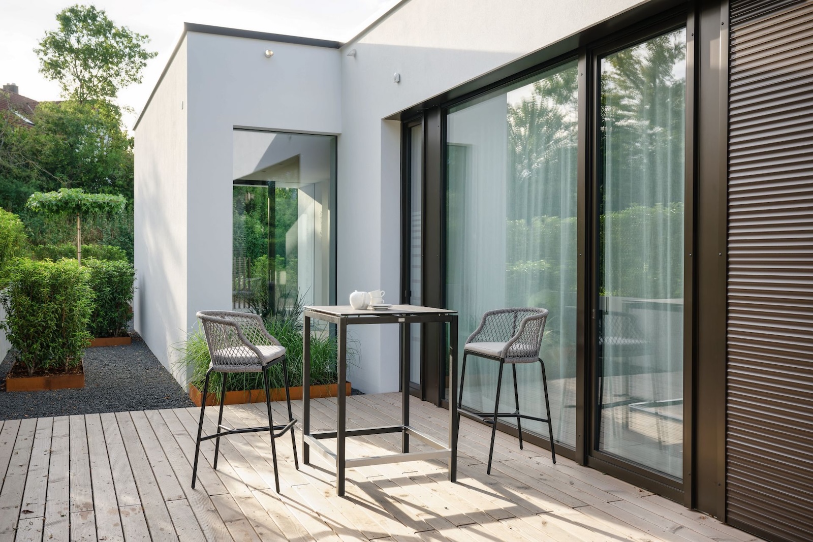 Ein stilvoller Hochlehner für moderne Outdoor-Bereiche, perfekt für Barhöhen und Thekenlösungen.