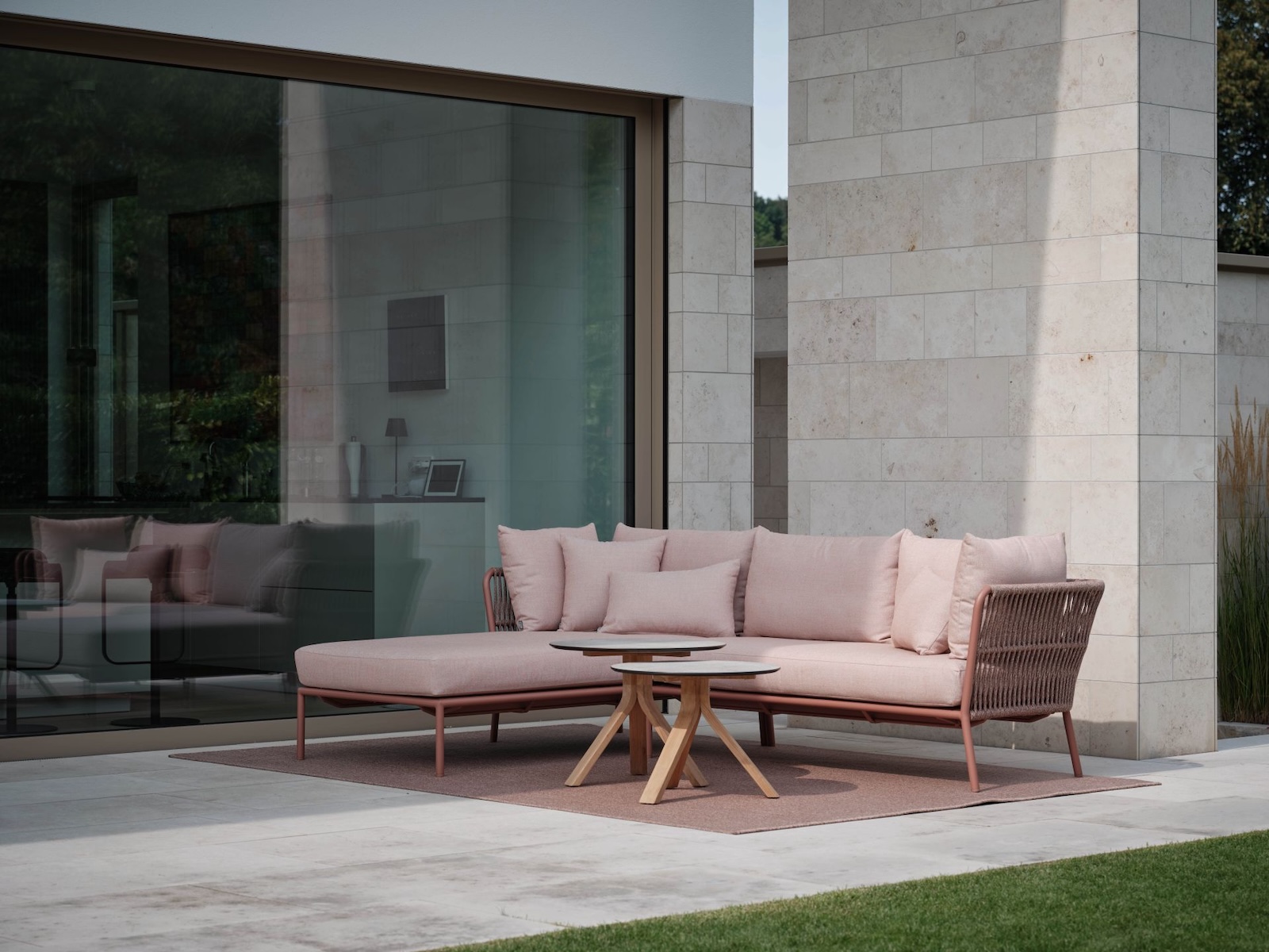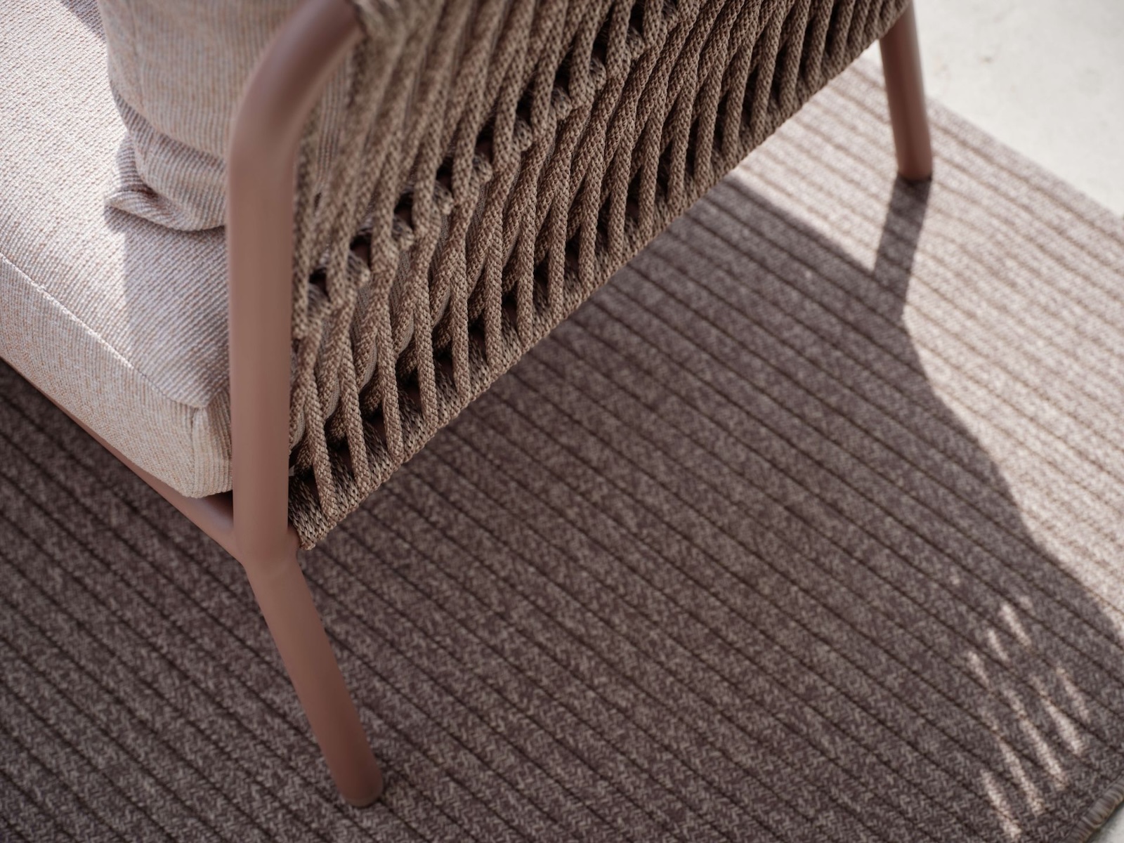 Der rechteckige Teppich ist speziell für den Außenbereich konzipiert und widerstandsfähig gegenüber Witterungseinflüssen. Das Kordel-Design in Terra schafft eine natürliche, warme Optik, die sich harmonisch in jedes Outdoor-Konzept einfügt.