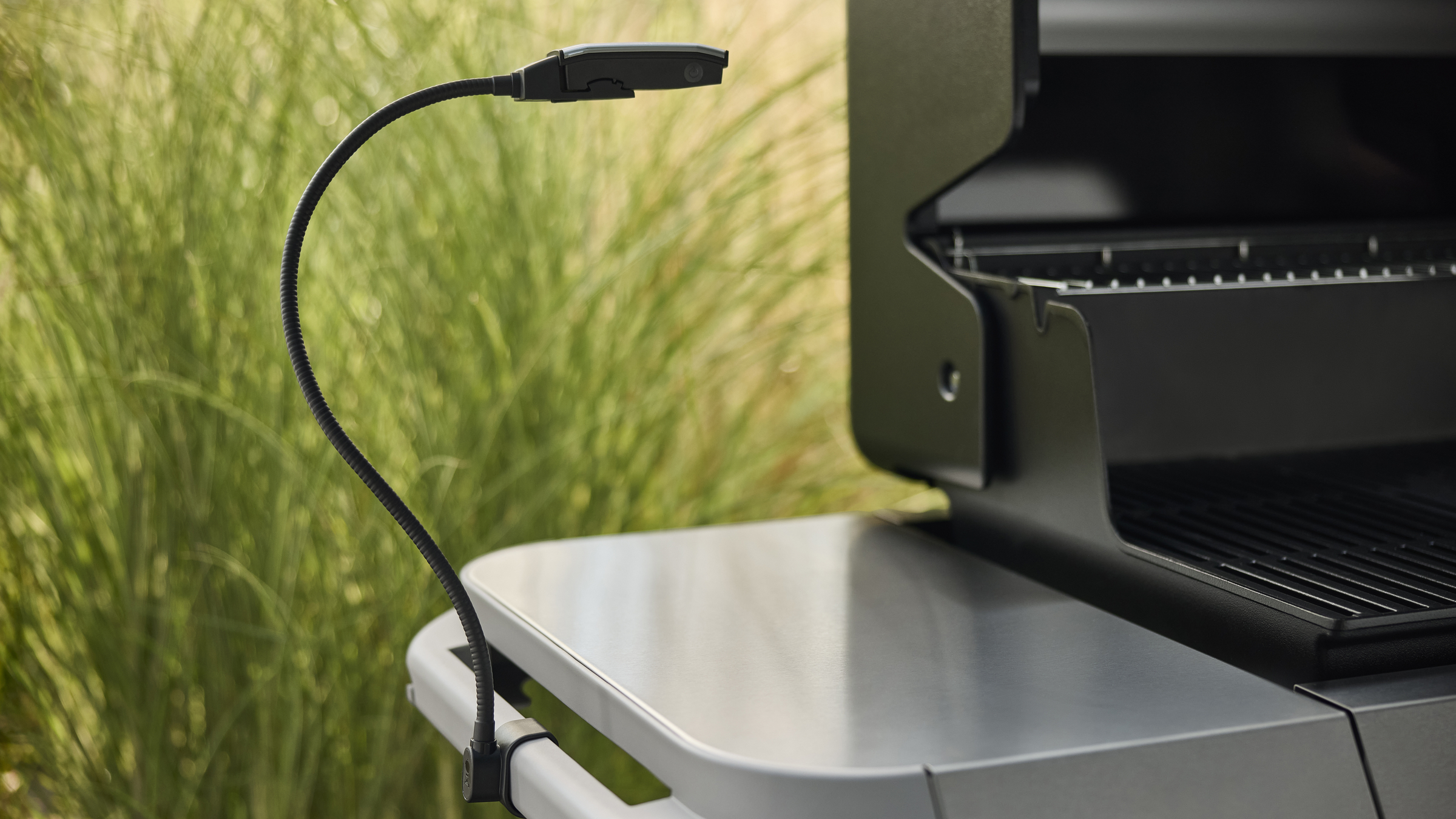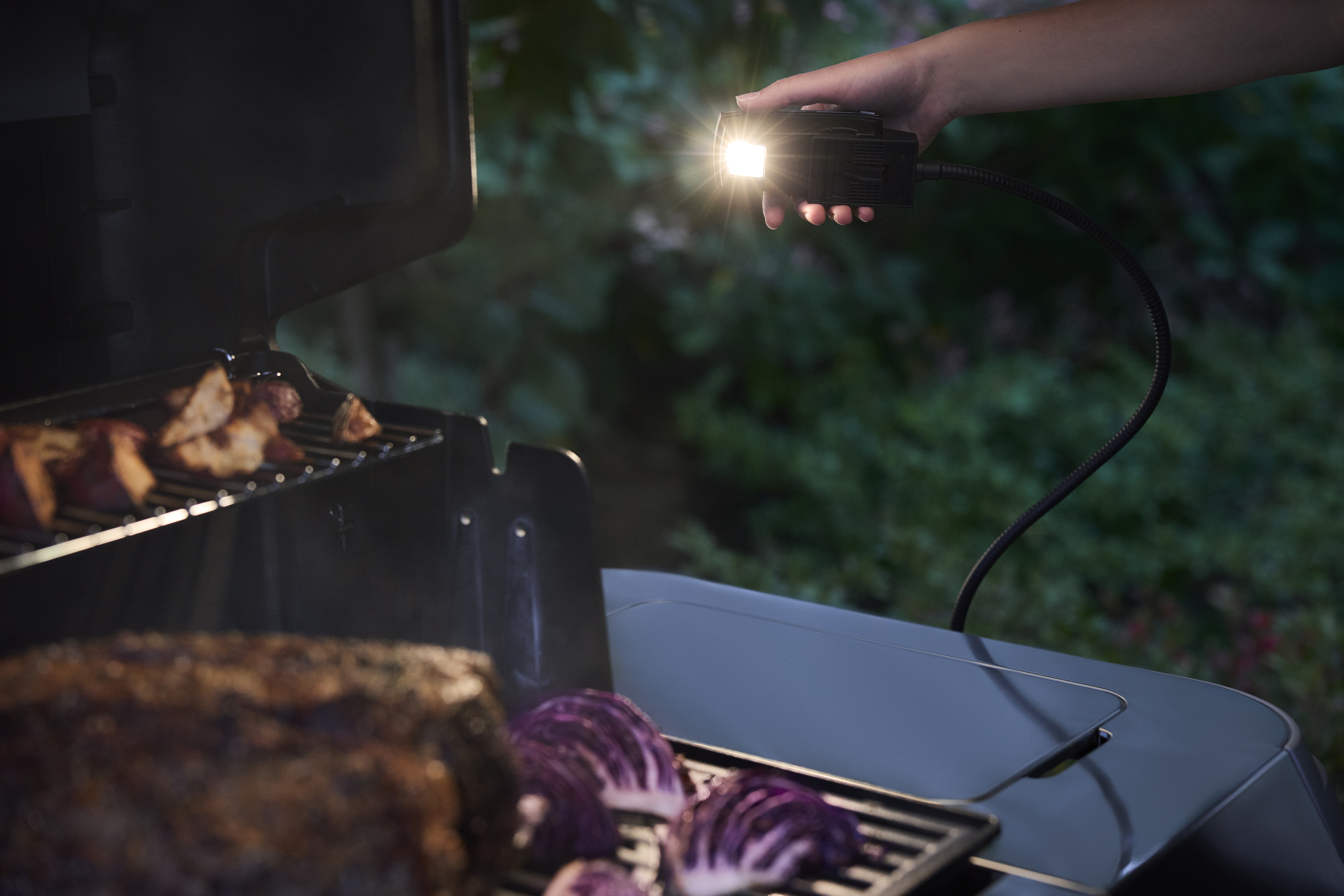 Der flexible Arm erlaubt es, den Lichtstrahl genau dorthin zu lenken, wo Sie ihn benötigen. Zudem kann das Licht vom Arm abgenommen und als Taschenlampe verwendet werden – ideal, um den Weg durch den Garten zu erhellen. Der integrierte Bewegungssensor schaltet das Licht ein, wenn der Grilldeckel angehoben wird, und beim Schließen des Grilldeckels wieder aus, um die Batterielebensdauer zu verlängern.