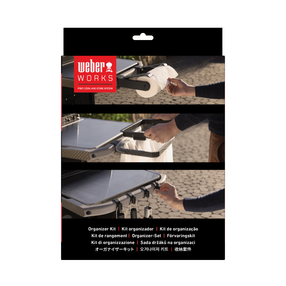 Halten Sie Papierhandtücher, Werkzeuge und Müllbeutel mit dem Weber WORKS Snap-on Organizer Kit griffbereit und einsatzbereit. Befestigen Sie das Zubehör einfach an der Weber WORKS-Schiene, um sicherzustellen, dass Ihre wichtigsten Utensilien immer in Reichweite der Grillplatte sind, wenn Sie sie brauchen.