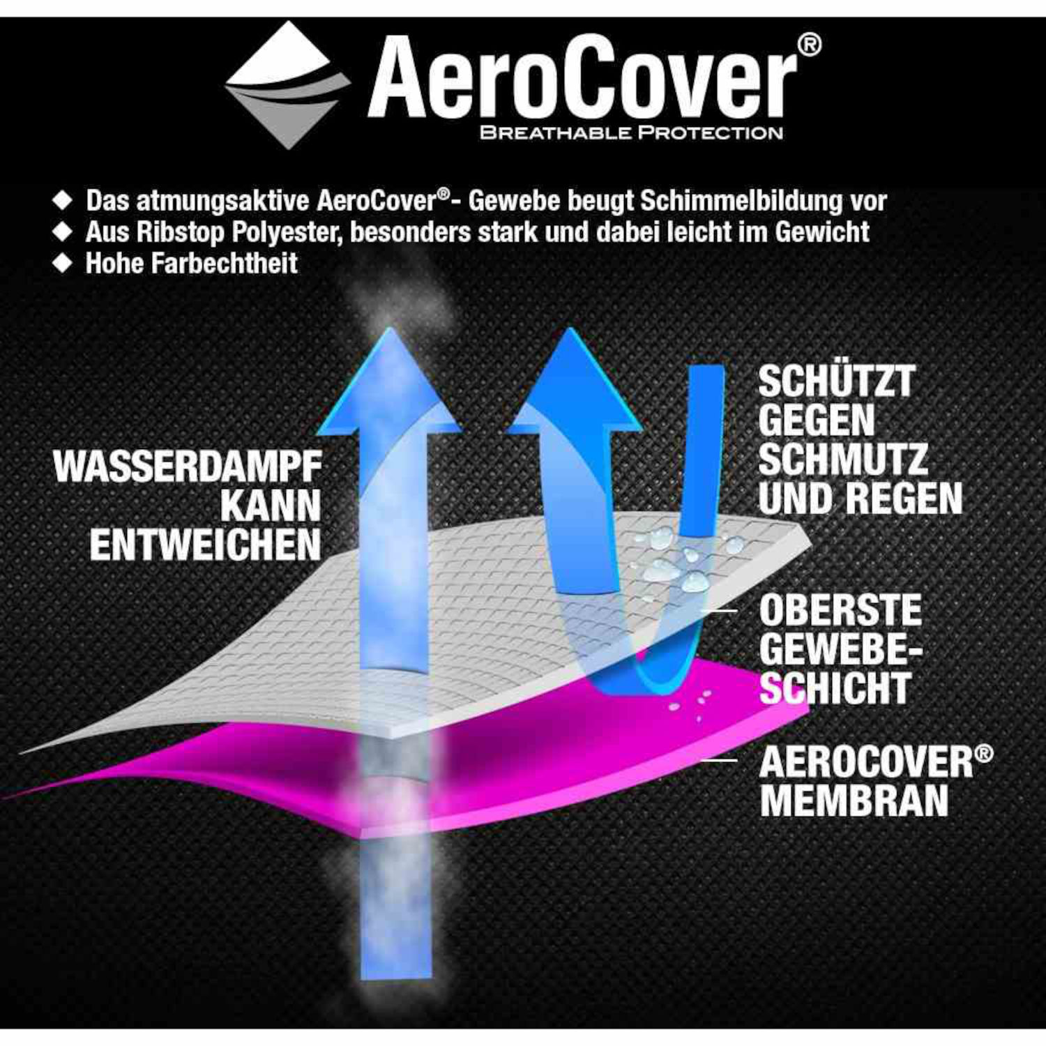 Alle AeroCover-Schutzhüllen sind aus leichtem Ripstop-Polyester hergestellt. Sie verfügen über eine atmungsaktive Membran, welche das Eindringen von Wasser, Staub und Schmutz verhindert und gleichzeitig das durch Temperaturschwankungen entstehende Kondenswasser nach außen leitet. Dies schützt Ihre Möbel vor Schimmel und verlängert so die Lebensdauer.