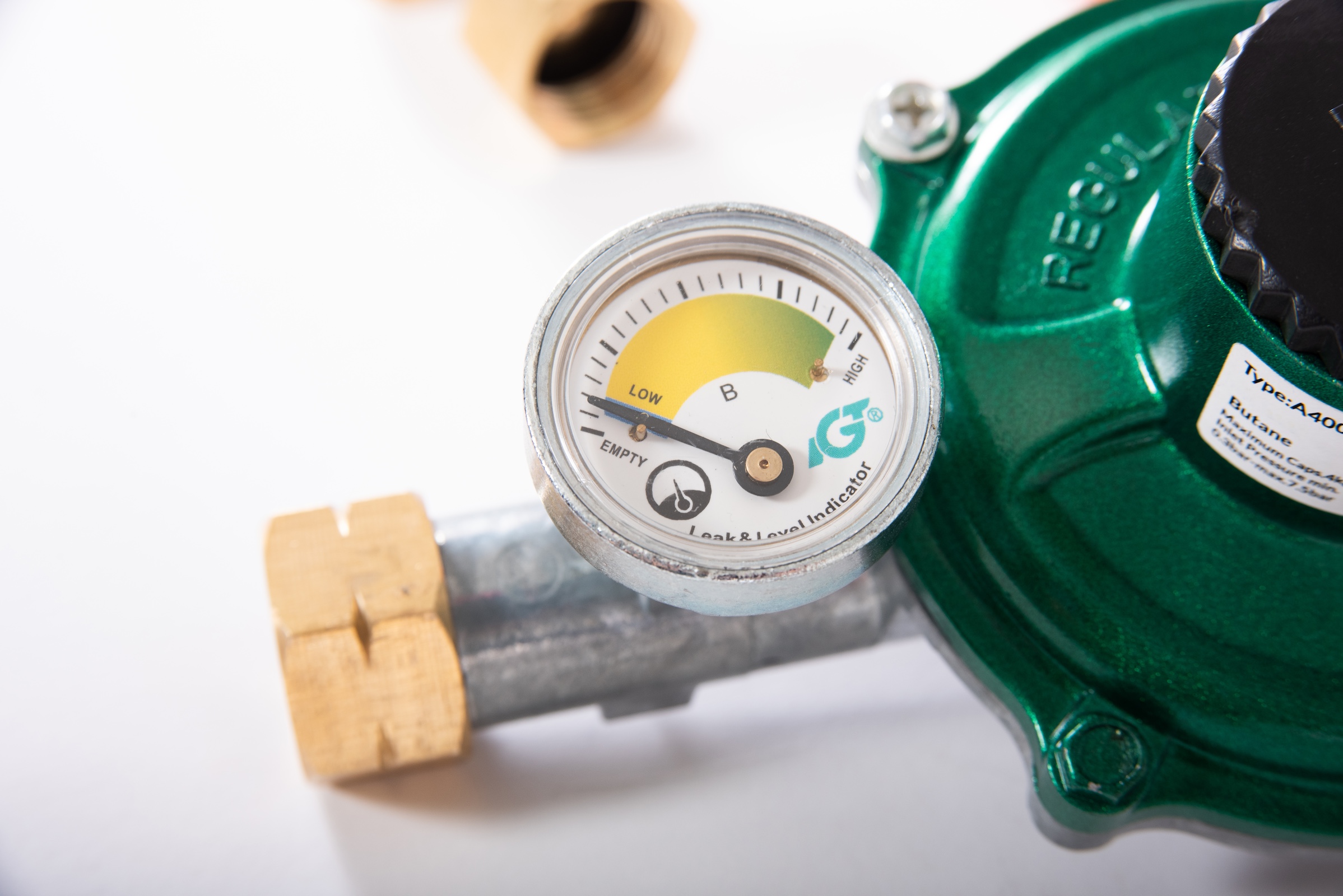 - 1 Manometer zur Überprüfung des Drucks des in der Flasche vorhandenen Flüssiggases mit Anzeige der Menge und Erkennung von Lecks bei Verschluss des Gasdurchgangs