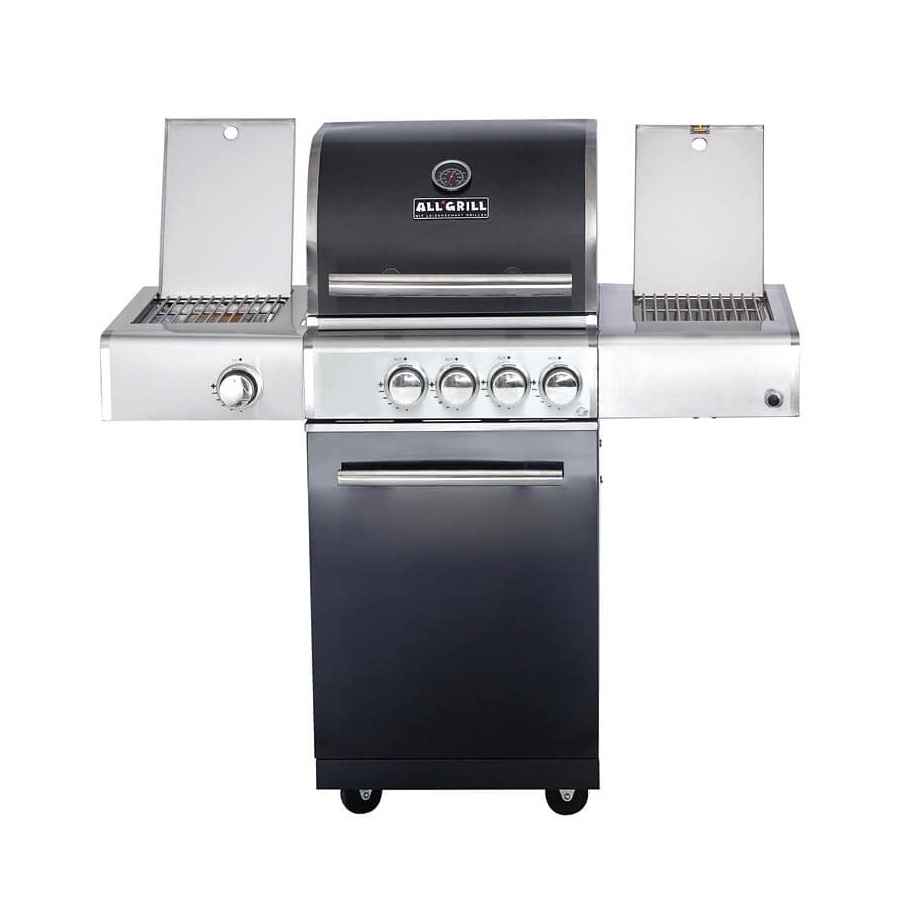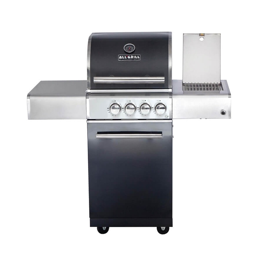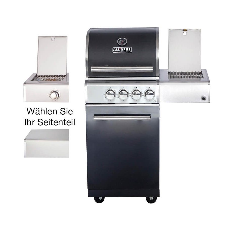 Der ALLGRILL CHEF S Black als Grundmodell ist ausgestattet mit 2 stufenlos regelbaren Brennern, einem klappbaren rechten Seitentisch mit Seitenkocher und einem Heckbrenner.