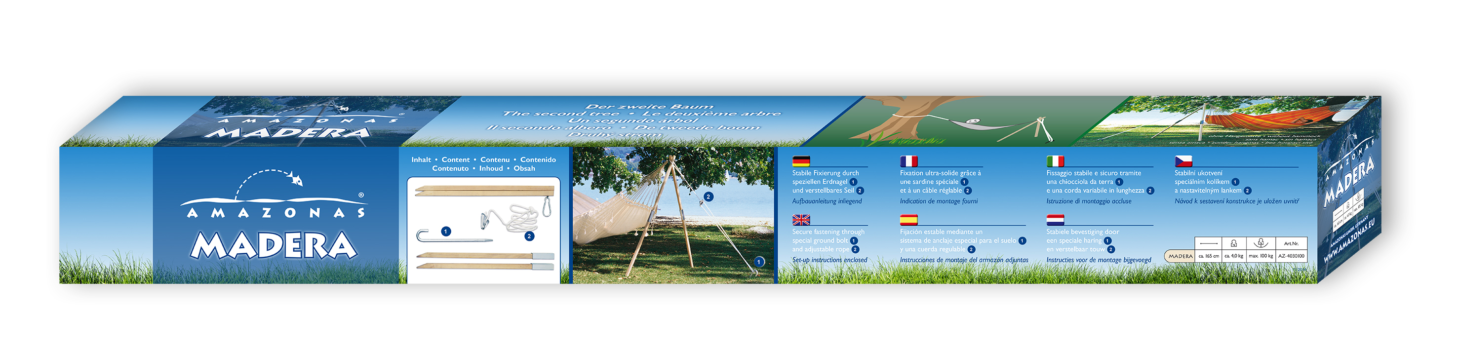 Das robuste, wetterfeste Material macht Madera zu einem optischen Highlight in der Gartengestaltung oder auf dem Campingplatz. Durch den flexiblen Einsatzbereich des Gestells eignet sich Madera zur Kombination mit allen AMAZONAS Hängematten. Das ohne Schrauben zusammensteckbare One-Side Hängemattengestell aus Eschenholz wird mit einem Erdnagel im Boden verankert - so erhalten Sie Ihr individuelles Hängemattengestell aus Holz für Ihren Garten.