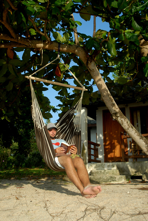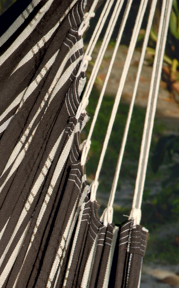 Der besonders weiche Stoff aus 100 % Baumwolle wird in Handarbeit gewebt. Wie alle Sessel aus der Brasil Reihe ist auch dieser Sessel original brasilianische Qualitätsware. Die Querstrebe aus Holz mit einer Länge von 110 cm spreizt das 160 cm lange und 130 cm breite Tuch auf und bietet auch für größere Personen ausreichend Platz. Einkerbungen an beiden Enden des Holzstabes sorgen für Fixierung der Aufhängeschnüre und verhindern ein Verrutschen dieser. Mit nur 2,7 kg ist dieser Sessel auch in einer Wohnung sehr praktisch. Sollte der Sessel im Weg sein, einfach abhängen und am Spreizstab zusammenrollen. So kann man ihn rasch verstauen.