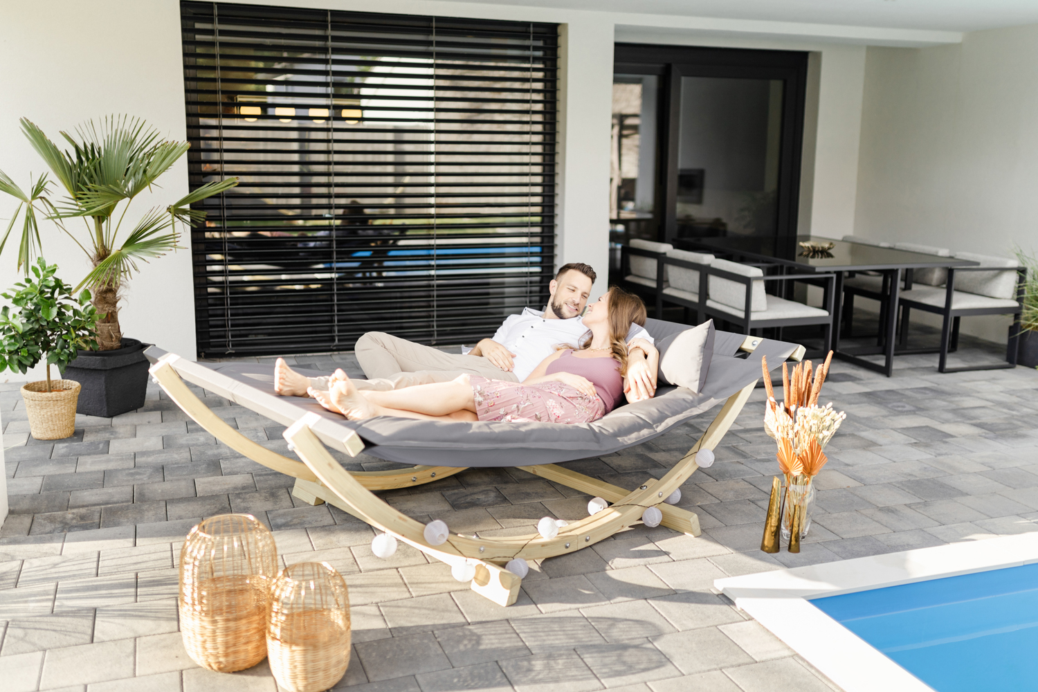- Besonders dick gefütterte Luxusliege für bis zu 2 Personen (so groß wie ein Doppelbett) - Wasserabweisende und extra schnell trocknende Polsterung - Abnehmbares, extra weich gepolstertes Kissen (waschbar ohne Polsterung) - Feinstes FSC-zertifiziertes Holz (wetterfest behandelte Fichte) - Liegefläche: ca. 190 x 130 cm
