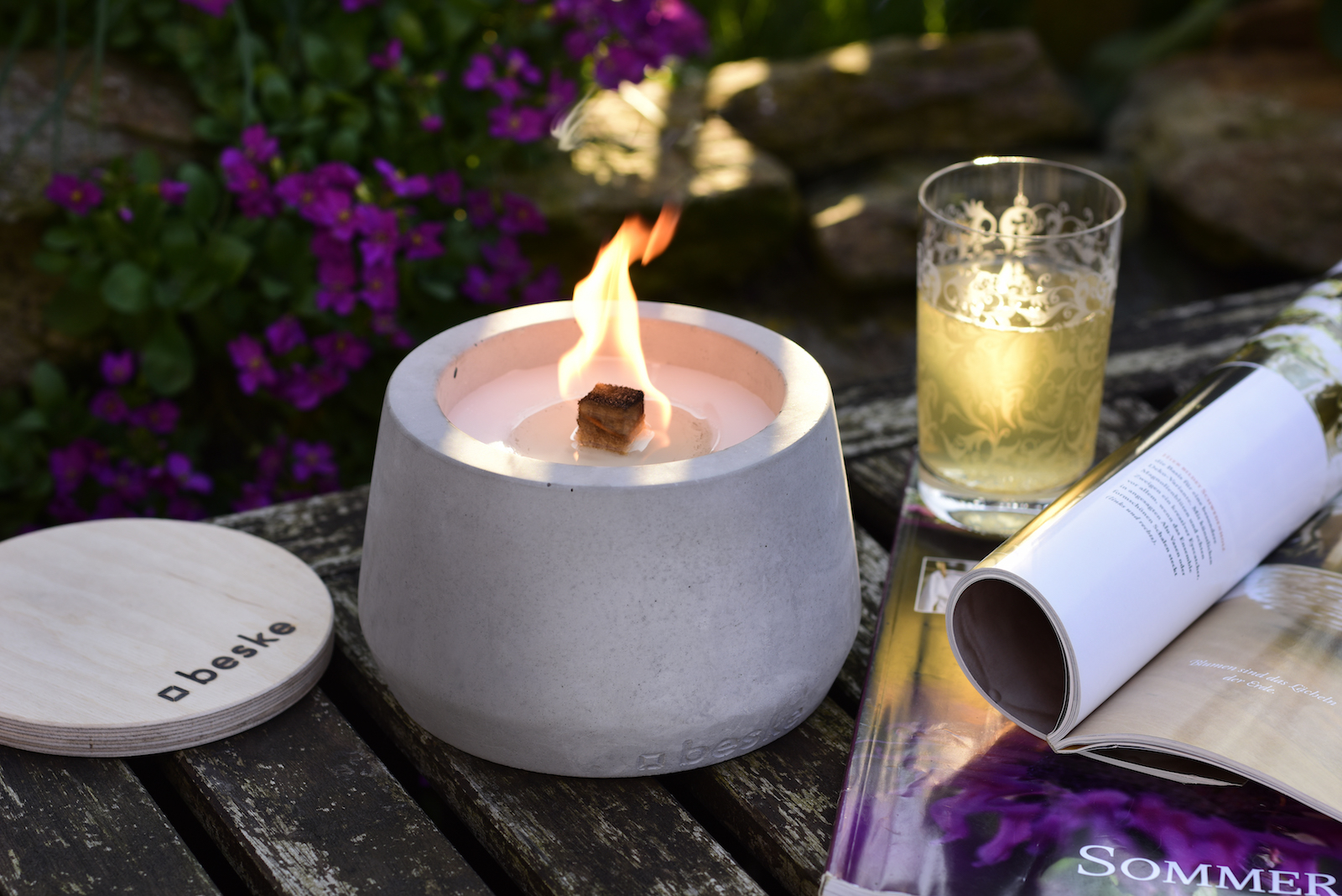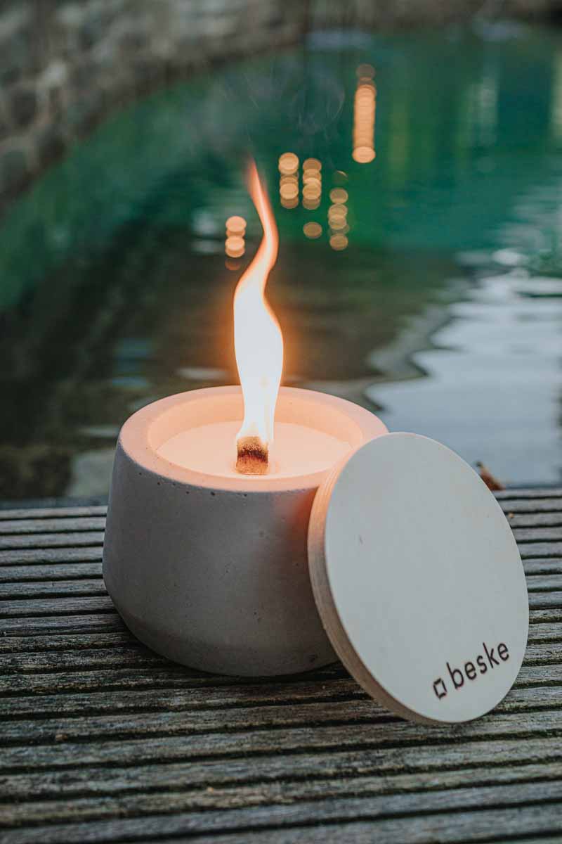 BETONFEUER® DER BESKE-MANUFAKTUR – DIE IDEE DAHINTER: Die Betonfeuer wurden einst entwickelt, um eine sinnvolle Verwendung für Kerzenreste zu ermöglichen. Wer kennt es nicht: Die meisten Kerzen brennen nicht komplett runter. Wachs allerdings ist teuer und jeder liebt es eine Flamme, egal ob Kerze, Lagerfeuer oder Gartenfackel, in naher Umgebung um sich herum zu haben. Das Betonfeuer ist die perfekte Lösung. Der natürlich abbaubare Dauerdocht verwandelt Kerzenreste in langanhaltende Gemütlichkeit und Romantik und erzeugt im Handumdrehen eine echte Lagerfeueratmosphäre.