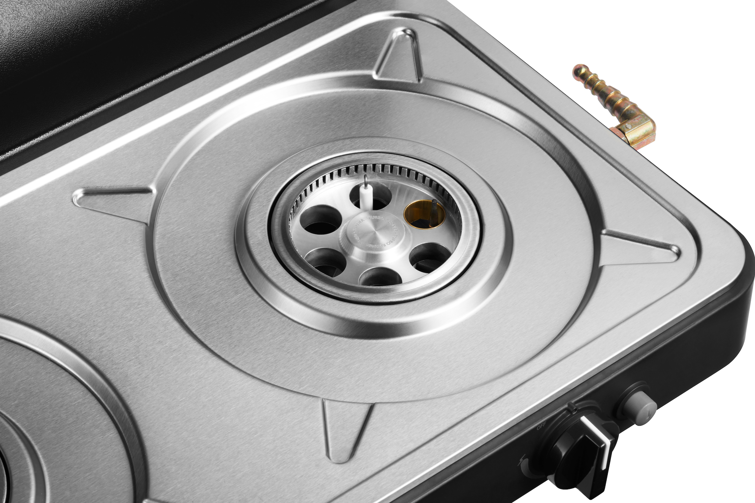 Das neue Design des Innenflammenbrenners sorgt für eine höhere Wärmeabgabe an die Kochfläche, wodurch Gas gespart und eine schnellere Hitze erzielt wird. Die beiden inneren Flammenbrenner liegen tiefer im Boden des Ofens, was ein schlankeres Design ermöglicht, das weniger von Wind beeinflusst wird. Jeder Brenner wird unabhängig mit einem eigenen Bedienknopf und einer Piezo-Zündung bedient.